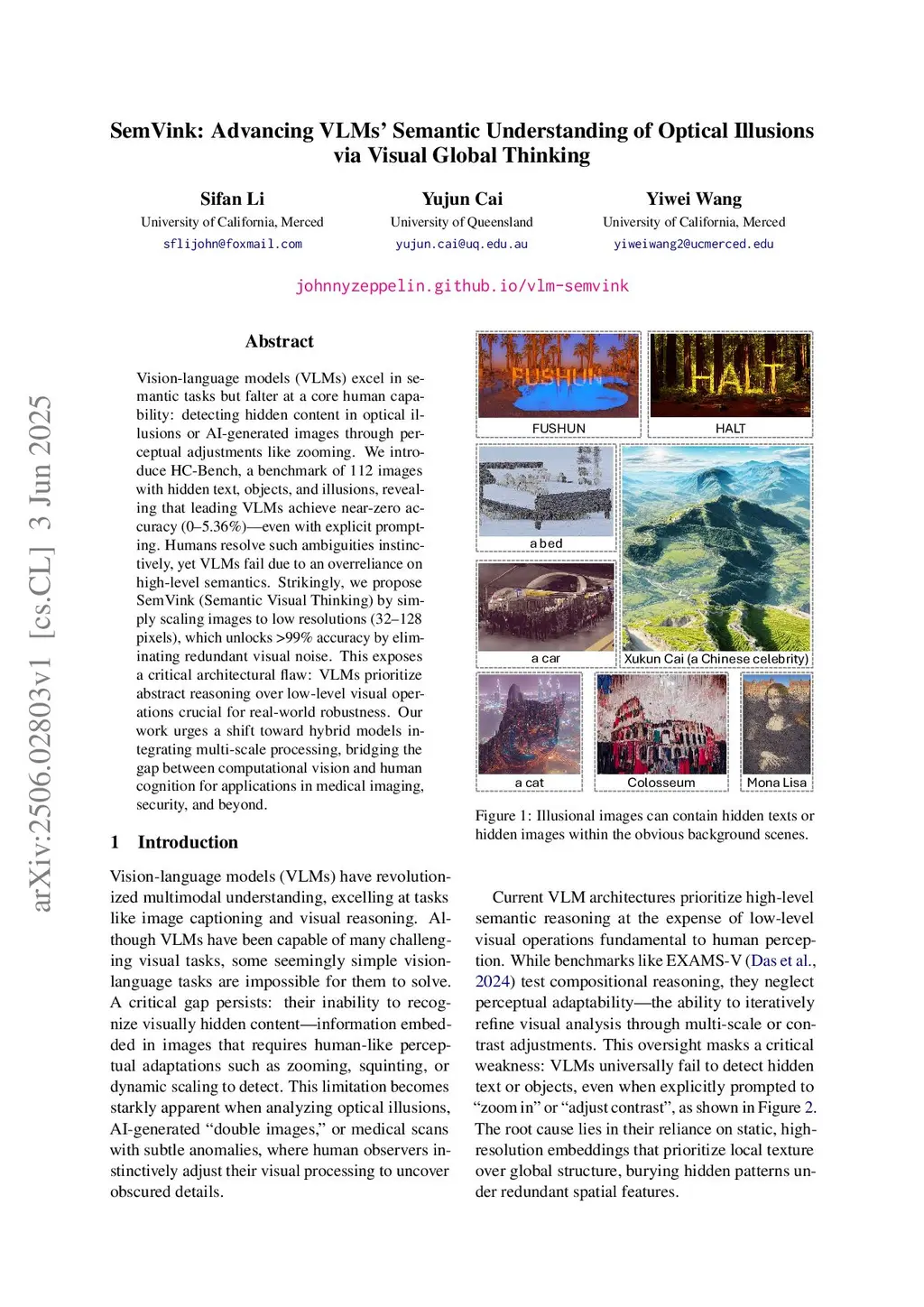 Vision-language models (VLMs) excel in semantic tasks but falter at a core human capability: detecting hidden content in optical illusions or AI-generated images through perceptual adjustments like zooming. We introduce HC-Bench, a benchmark of 112 images with hidden text, objects, and illusions, revealing that leading VLMs achieve near-zero accuracy (0-5.36%)-even with explicit prompting. Humans resolve such ambiguities instinctively, yet VLMs fail due to an overreliance on high-level semantics. Strikingly, we propose SemVink (Semantic Visual Thinking) by simply scaling images to low resolutions (32-128 pixels), which unlocks >99% accuracy by eliminating redundant visual noise. This exposes a critical architectural flaw: VLMs prioritize abstract reasoning over low-level visual operations crucial for real-world robustness. Our work urges a shift toward hybrid models integrating multi-scale processing, bridging the gap between computational vision and human cognition for applications in medical imaging, security, and beyond.
