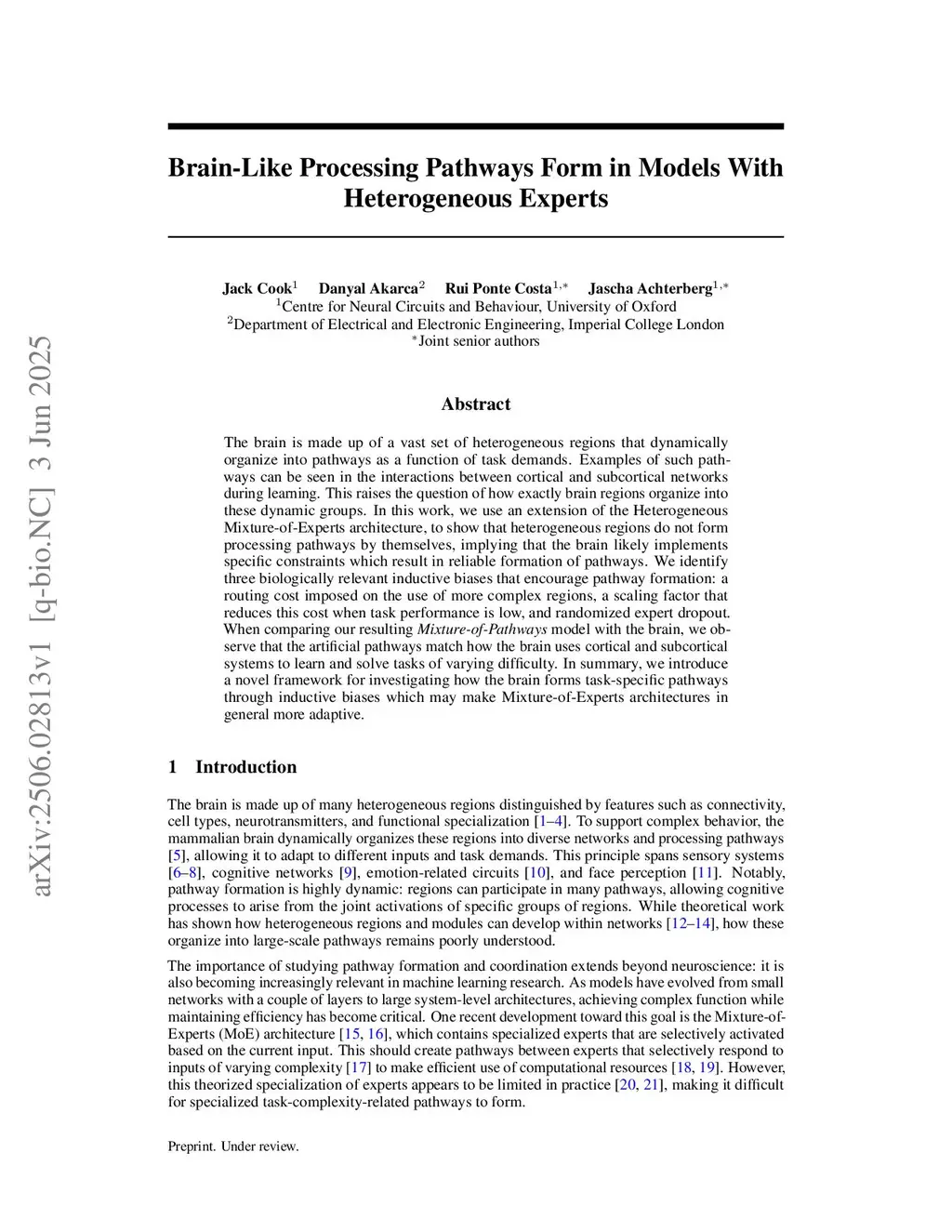 Brain-Like Processing Pathways Form in Models With Heterogeneous Experts