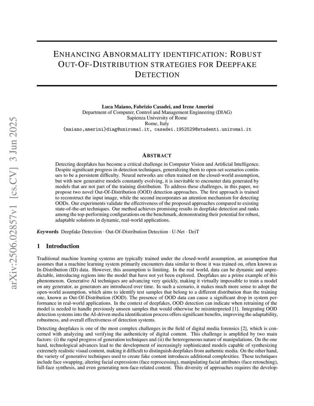 Detecting deepfakes has become a critical challenge in Computer Vision and Artificial Intelligence. Despite significant progress in detection techniques, generalizing them to open-set scenarios continues to be a persistent difficulty. Neural networks are often trained on the closed-world assumption, but with new generative models constantly evolving, it is inevitable to encounter data generated by models that are not part of the training distribution. To address these challenges, in this paper, we propose two novel Out-Of-Distribution (OOD) detection approaches. The first approach is trained to reconstruct the input image, while the second incorporates an attention mechanism for detecting OODs. Our experiments validate the effectiveness of the proposed approaches compared to existing state-of-the-art techniques. Our method achieves promising results in deepfake detection and ranks among the top-performing configurations on the benchmark, demonstrating their potential for robust, adaptable solutions in dynamic, real-world applications.
