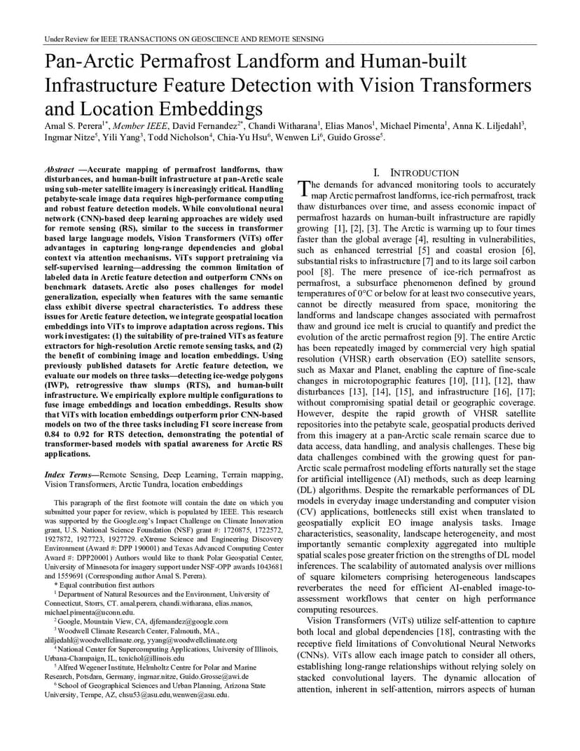Accurate mapping of permafrost landforms, thaw disturbances, and human-built infrastructure at pan-Arctic scale using sub-meter satellite imagery is increasingly critical. Handling petabyte-scale image data requires high-performance computing and robust feature detection models. While convolutional neural network (CNN)-based deep learning approaches are widely used for remote sensing (RS),similar to the success in transformer based large language models, Vision Transformers (ViTs) offer advantages in capturing long-range dependencies and global context via attention mechanisms. ViTs support pretraining via self-supervised learning-addressing the common limitation of labeled data in Arctic feature detection and outperform CNNs on benchmark datasets. Arctic also poses challenges for model generalization, especially when features with the same semantic class exhibit diverse spectral characteristics. To address these issues for Arctic feature detection, we integrate geospatial location embeddings into ViTs to improve adaptation across regions. This work investigates: (1) the suitability of pre-trained ViTs as feature extractors for high-resolution Arctic remote sensing tasks, and (2) the benefit of combining image and location embeddings. Using previously published datasets for Arctic feature detection, we evaluate our models on three tasks-detecting ice-wedge polygons (IWP), retrogressive thaw slumps (RTS), and human-built infrastructure. We empirically explore multiple configurations to fuse image embeddings and location embeddings. Results show that ViTs with location embeddings outperform prior CNN-based models on two of the three tasks including F1 score increase from 0.84 to 0.92 for RTS detection, demonstrating the potential of transformer-based models with spatial awareness for Arctic RS applications.