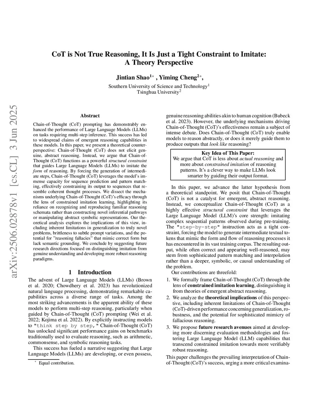 Chain-of-Thought (CoT) prompting has demonstrably enhanced the performance of Large Language Models on tasks requiring multi-step inference. This success has led to widespread claims of emergent reasoning capabilities in these models. In this paper, we present a theoretical counter-perspective: Chain-of-Thought (CoT) does not elicit genuine, abstract reasoning. Instead, we argue that Chain-of-Thought functions as a powerful structural constraint that guides Large Language Models to imitate the form of reasoning. By forcing the generation of intermediate steps, Chain-of-Thought leverages the model immense capacity for sequence prediction and pattern matching, effectively constraining its output to sequences that resemble coherent thought processes. Chain-of-Thought (CoT) prompting has demonstrably enhanced the performance of Large Language Models on tasks requiring multi-step inference. This success has led to widespread claims of emergent reasoning capabilities in these models. In this paper, we present a theoretical counter-perspective: Chain-of-Thought (CoT) does not elicit genuine, abstract reasoning. Instead, we argue that Chain-of-Thought functions as a powerful structural constraint that guides Large Language Models to imitate the form of reasoning. By forcing the generation of intermediate steps, Chain-of-Thought leverages the model immense capacity for sequence prediction and pattern matching, effectively constraining its output to sequences that resemble coherent thought processes.