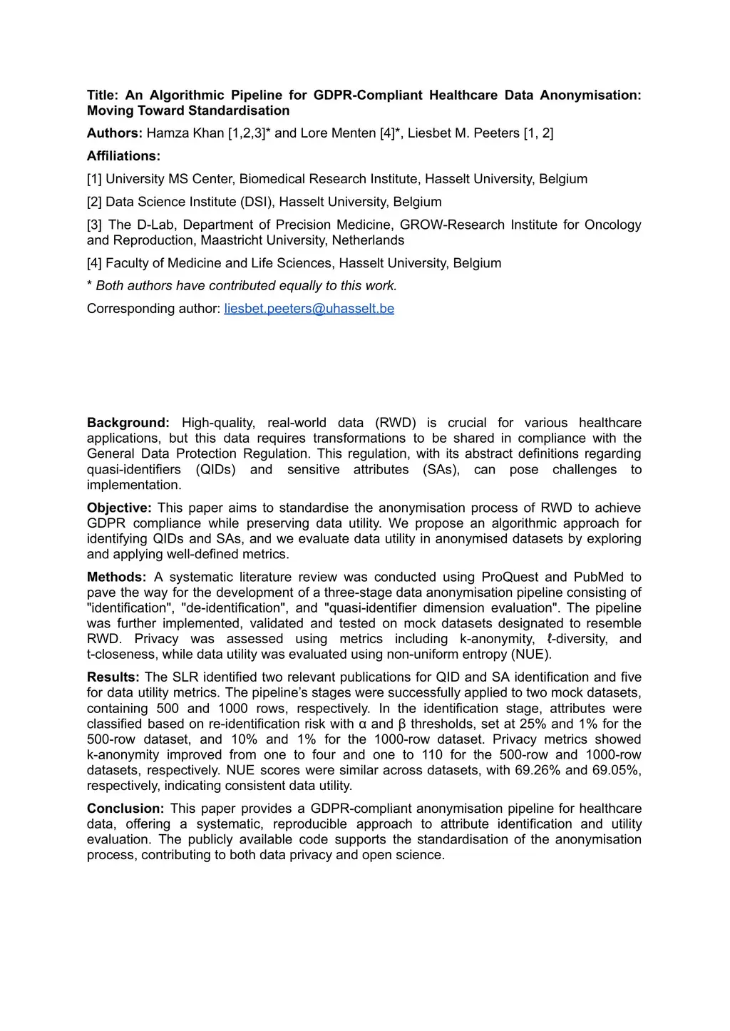 High-quality real-world data (RWD) is essential for healthcare but must be transformed to comply with the General Data Protection Regulation (GDPR). GDPRs broad definitions of quasi-identifiers (QIDs) and sensitive attributes (SAs) complicate implementation. We aim to standardise RWD anonymisation for GDPR compliance while preserving data utility by introducing an algorithmic method to identify QIDs and SAs and evaluate utility in anonymised datasets. We conducted a systematic literature review via ProQuest and PubMed to inform a three-stage anonymisation pipeline: identification, de-identification, and quasi-identifier dimension evaluation. The pipeline was implemented, validated, and tested on two mock RWD datasets (500 and 1000 rows). Privacy was assessed using k-anonymity, l-diversity, and t-closeness; utility was measured by non-uniform entropy (NUE). The review yielded two studies on QID/SA identification and five on utility metrics. Applying the pipeline, attributes were classified by re-identification risk using alpha and beta thresholds (25 percent/1 percent for 500 rows; 10 percent/1 percent for 1000 rows). Privacy metrics improved k-anonymity from 1 to 4 (500 rows) and 1 to 110 (1000 rows). NUE scores were 69.26 percent and 69.05 percent, respectively, indicating consistent utility despite varying privacy gains. We present a GDPR-compliant anonymisation pipeline for healthcare RWD that provides a reproducible approach to QID/SA identification and utility evaluation; publicly available code promotes standardisation, data privacy, and open science.