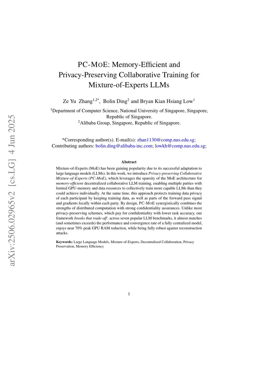 Mixture-of-Experts (MoE) has been gaining popularity due to its successful adaptation to large language models (LLMs). In this work, we introduce Privacy-preserving Collaborative Mixture-of-Experts (PC-MoE), which leverages the sparsity of the MoE architecture for memory-efficient decentralized collaborative LLM training, enabling multiple parties with limited GPU-memory and data resources to collectively train more capable LLMs than they could achieve individually. At the same time, this approach protects training data privacy of each participant by keeping training data, as well as parts of the forward pass signal and gradients locally within each party. By design, PC-MoE synergistically combines the strengths of distributed computation with strong confidentiality assurances. Unlike most privacy-preserving schemes, which pay for confidentiality with lower task accuracy, our framework breaks that trade-off: across seven popular LLM benchmarks, it almost matches (and sometimes exceeds) the performance and convergence rate of a fully centralized model, enjoys near 70% peak GPU RAM reduction, while being fully robust against reconstruction attacks.