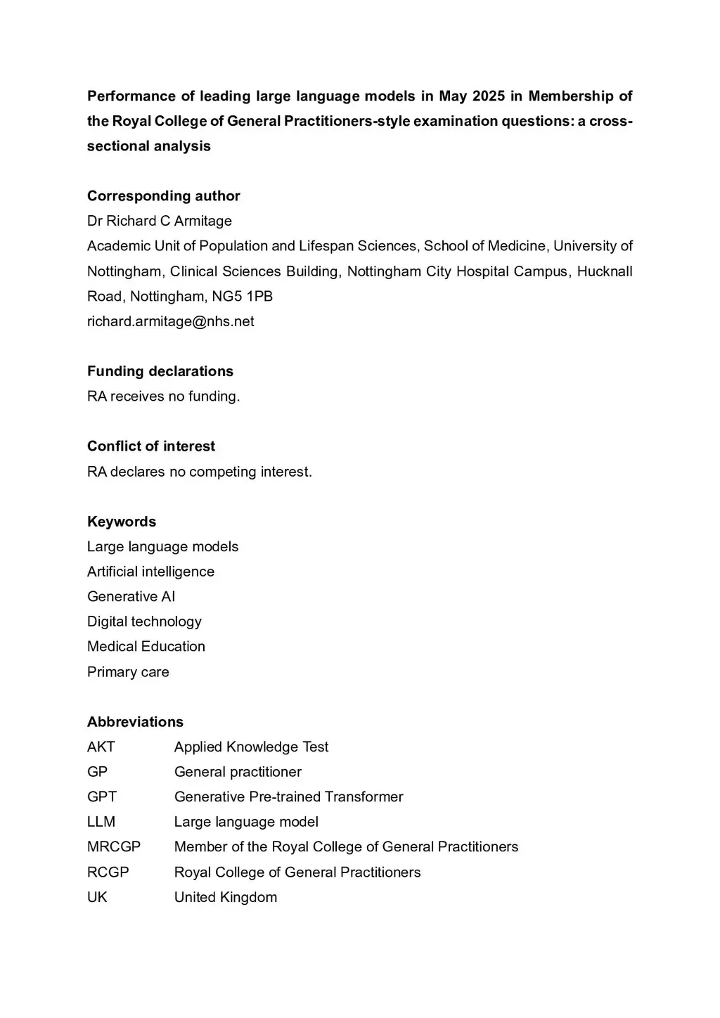 Performance of leading large language models in May 2025 in Membership of the Royal College of General Practitioners-style examination questions: a cross-sectional analysis