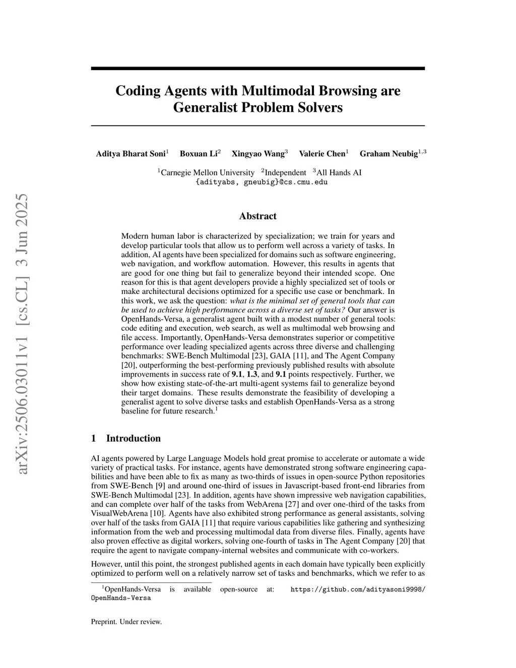 Modern human labor is characterized by specialization; we train for years and develop particular tools that allow us to perform well across a variety of tasks. In addition, AI agents have been specialized for domains such as software engineering, web navigation, and workflow automation. However, this results in agents that are good for one thing but fail to generalize beyond their intended scope. One reason for this is that agent developers provide a highly specialized set of tools or make architectural decisions optimized for a specific use case or benchmark. In this work, we ask the question: what is the minimal set of general tools that can be used to achieve high performance across a diverse set of tasks? Our answer is OpenHands-Versa, a generalist agent built with a modest number of general tools: code editing and execution, web search, as well as multimodal web browsing and file access. Importantly, OpenHands-Versa demonstrates superior or competitive performance over leading specialized agents across three diverse and challenging benchmarks: SWE-Bench Multimodal, GAIA, and The Agent Company, outperforming the best-performing previously published results with absolute improvements in success rate of 9.1, 1.3, and 9.1 points respectively. Further, we show how existing state-of-the-art multi-agent systems fail to generalize beyond their target domains. These results demonstrate the feasibility of developing a generalist agent to solve diverse tasks and establish OpenHands-Versa as a strong baseline for future research.