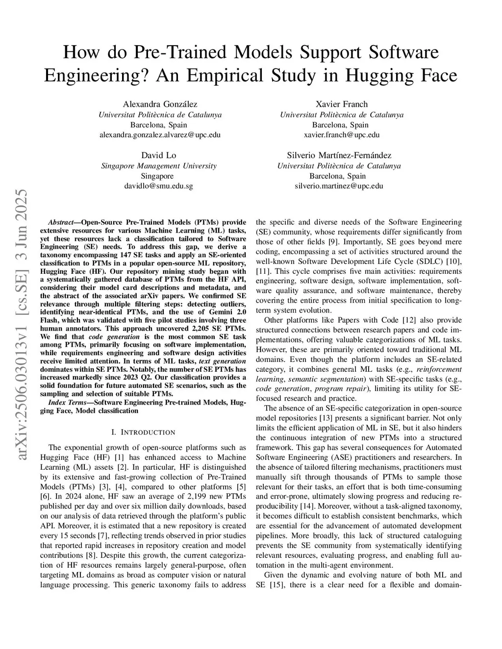 Context: Open-source Pre-Trained Models (PTMs) provide extensive resources for various Machine Learning (ML) tasks, yet these resources lack a classification tailored to Software Engineering (SE) needs to support the reliable identification and reuse of models for SE. Objective: To address this gap, we derive a taxonomy encompassing 147 SE tasks and apply an SE-oriented classification to PTMs in a popular open-source ML repository, Hugging Face (HF). Method: Our repository mining study followed a five-phase pipeline: (i) identification SE tasks from the literature; (ii) collection of PTM data from the HF API, including model card descriptions and metadata, and the abstracts of the associated arXiv papers; (iii) text processing to ensure consistency; (iv) a two-phase validation of SE relevance, involving humans and LLM assistance, supported by five pilot studies with human annotators and a generalization test; (v) and data analysis. This process yielded a curated catalogue of 2,205 SE PTMs. Results: We find that most SE PTMs target code generation and coding, emphasizing implementation over early or late development stages. In terms of ML tasks, text generation dominates within SE PTMs. Notably, the number of SE PTMs has increased markedly since 2023 Q2, while evaluation remains limited: only 9.6% report benchmark results, mostly scoring below 50%. Conclusions: Our catalogue reveals documentation and transparency gaps, highlights imbalances across SDLC phases, and provides a foundation for automated SE scenarios, such as the sampling and selection of suitable PTMs.