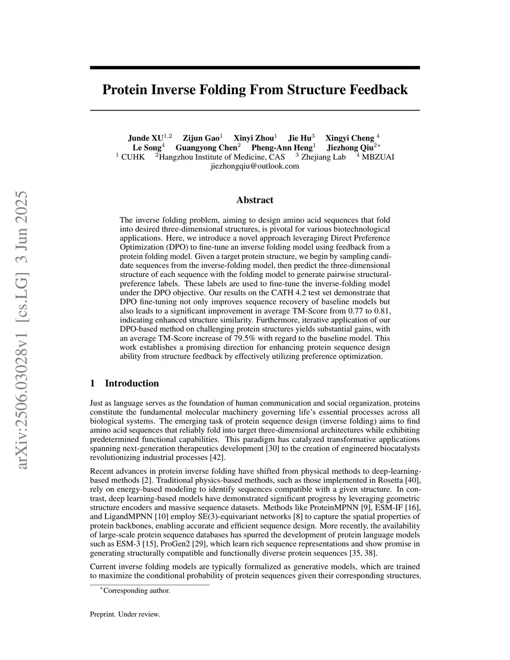 The inverse folding problem, aiming to design amino acid sequences that fold into desired three-dimensional structures, is pivotal for various biotechnological applications. Here, we introduce a novel approach leveraging Direct Preference Optimization (DPO) to fine-tune an inverse folding model using feedback from a protein folding model. Given a target protein structure, we begin by sampling candidate sequences from the inverse-folding model, then predict the three-dimensional structure of each sequence with the folding model to generate pairwise structural-preference labels. These labels are used to fine-tune the inverse-folding model under the DPO objective. Our results on the CATH 4.2 test set demonstrate that DPO fine-tuning not only improves sequence recovery of baseline models but also leads to a significant improvement in average TM-Score from 0.77 to 0.81, indicating enhanced structure similarity. Furthermore, iterative application of our DPO-based method on challenging protein structures yields substantial gains, with an average TM-Score increase of 79.5\% with regard to the baseline model. This work establishes a promising direction for enhancing protein sequence design ability from structure feedback by effectively utilizing preference optimization.
