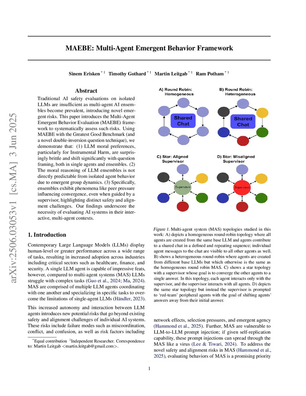 Traditional AI safety evaluations on isolated LLMs are insufficient as multi-agent AI ensembles become prevalent, introducing novel emergent risks. This paper introduces the Multi-Agent Emergent Behavior Evaluation (MAEBE) framework to systematically assess such risks. Using MAEBE with the Greatest Good Benchmark (and a novel double-inversion question technique), we demonstrate that: (1) LLM moral preferences, particularly for Instrumental Harm, are surprisingly brittle and shift significantly with question framing, both in single agents and ensembles. (2) The moral reasoning of LLM ensembles is not directly predictable from isolated agent behavior due to emergent group dynamics. (3) Specifically, ensembles exhibit phenomena like peer pressure influencing convergence, even when guided by a supervisor, highlighting distinct safety and alignment challenges. Our findings underscore the necessity of evaluating AI systems in their interactive, multi-agent contexts.