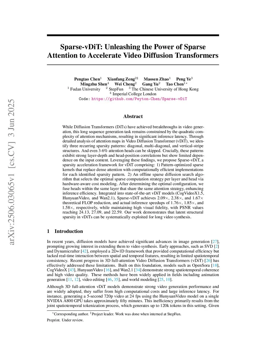 While Diffusion Transformers (DiTs) have achieved breakthroughs in video generation, this long sequence generation task remains constrained by the quadratic complexity of attention mechanisms, resulting in significant inference latency. Through detailed analysis of attention maps in Video Diffusion Transformer (vDiT), we identify three recurring sparsity patterns: diagonal, multi-diagonal, and vertical-stripe structures. And even 3-6\% attention heads can be skipped. Crucially, these patterns exhibit strong layer-depth and head-position correlations but show limited dependence on the input content. Leveraging these findings, we propose Sparse-vDiT, a sparsity acceleration framework for vDiT comprising: 1) Pattern-optimized sparse kernels that replace dense attention with computationally efficient implementations for each identified sparsity pattern. 2) An offline sparse diffusion search algorithm that selects the optimal sparse computation strategy per layer and head via hardware-aware cost modeling. After determining the optimal configuration, we fuse heads within the same layer that share the same attention strategy, enhancing inference efficiency. Integrated into state-of-the-art vDiT models (CogVideoX1.5, HunyuanVideo, and Wan2.1), Sparse-vDiT achieves 2.09, 2.38, and 1.67 theoretical FLOP reduction, and actual inference speedups of 1.76, 1.85, and 1.58, respectively, while maintaining high visual fidelity, with PSNR values reaching 24.13, 27.09, and 22.59. Our work demonstrates that latent structural sparsity in vDiTs can be systematically exploited for long video synthesis.