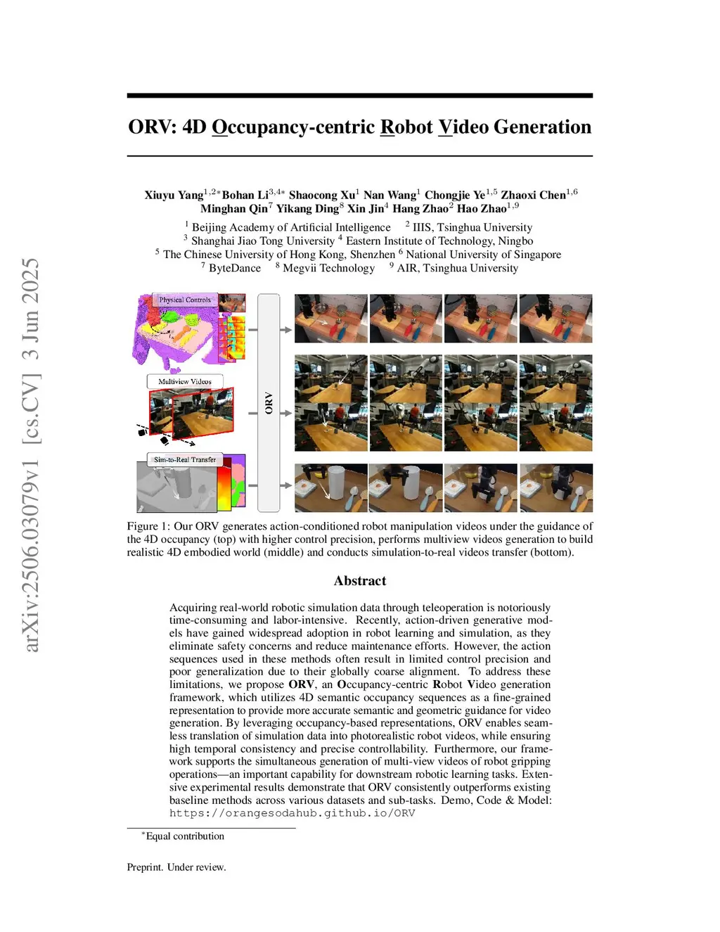 Recent embodied intelligence suffers from data scarcity, while conventional simulators lack visual realism. Controllable video generation is emerging as a promising data engine, yet current action-conditioned methods still fall short: generated videos are limited in fidelity and temporal consistency, poorly aligned with controls, and often constrained to singleview settings. We attribute these issues to the representational gap between sparse control inputs and dense pixel outputs. Thus, we introduce ORV, a 4D occupancy-centric framework for robot video generation that couples action priors with occupancy-derived visual priors. Concretely, we align chunked 7-DoF actions with video latents via an Action-Expert AdaLN modulation, and inject 2D renderings of 4D semantic occupancy into the generation process as soft guidance. Meanwhile, a central obstacle is the lack of occupancy data for embodied scenarios; we therefore curate ORV-Data, a large-scale, high-quality 4D semantic occupancy dataset of robot manipulation. Across BridgeV2, DROID, and RT-1, ORV improves video generation quality and controllability, achieving 18.8% lower FVD than state of the art, +3.5% success rate on visual planning, and +6.4% success rate on policy learning. Beyond singleview generation, ORV natively supports multiview consistent synthesis and enables simulation-to-real transfer despite significant domain gaps. Code, models, and data are at:this https URL