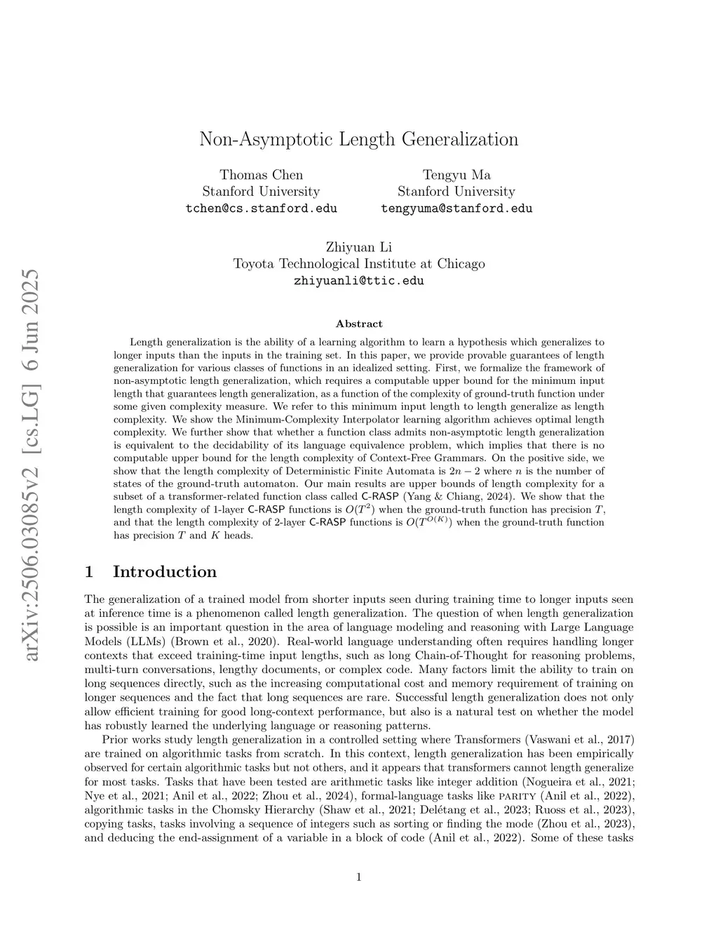 Length generalization is the ability of a learning algorithm to learn a hypothesis which generalizes to longer inputs than the inputs in the training set. In this paper, we provide provable guarantees of length generalization for various classes of functions in an idealized setting. First, we formalize the framework of non-asymptotic length generalization, which requires a computable upper bound for the minimum input length that guarantees length generalization, as a function of the complexity of ground-truth function under some given complexity measure. We refer to this minimum input length to length generalize as length complexity. We show the Minimum-Complexity Interpolator learning algorithm achieves optimal length complexity. We further show that whether a function class admits non-asymptotic length generalization is equivalent to the decidability of its language equivalence problem, which implies that there is no computable upper bound for the length complexity of Context-Free Grammars. On the positive side, we show that the length complexity of Deterministic Finite Automata is where is the number of states of the ground-truth automaton. Our main results are upper bounds of length complexity for a subset of a transformer-related function class called C-RASP (Yang & Chiang, 2024). We show that the length complexity of 1-layer C-RASP functions is when the ground-truth function has precision , and that the length complexity of 2-layer C-RASP functions is when the ground-truth function has precision and heads.