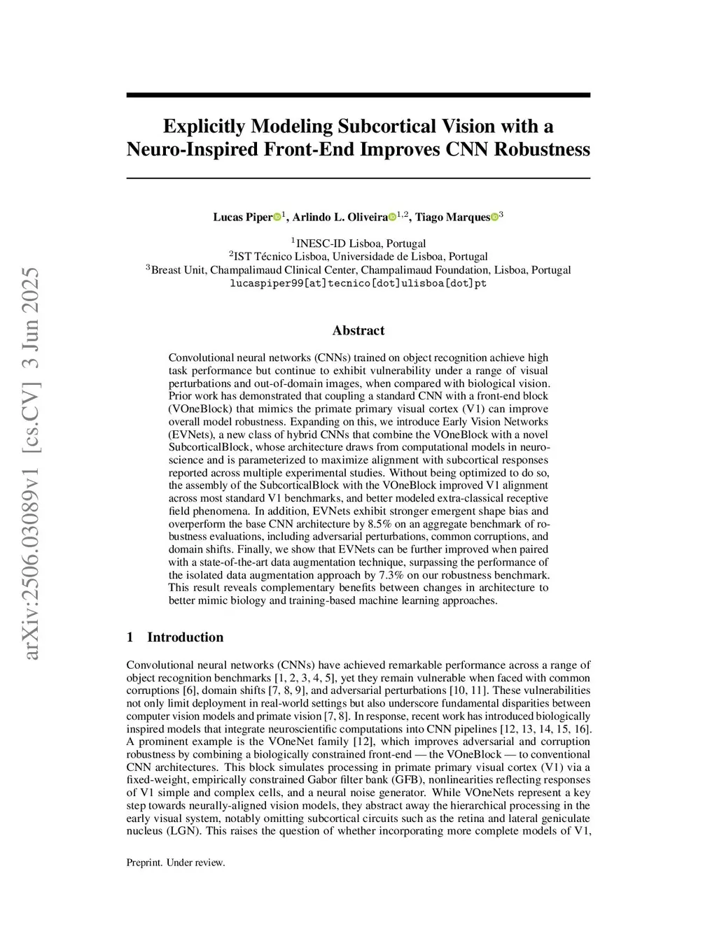 Convolutional neural networks (CNNs) trained on object recognition achieve high task performance but continue to exhibit vulnerability under a range of visual perturbations and out-of-domain images, when compared with biological vision. Prior work has demonstrated that coupling a standard CNN with a front-end (VOneBlock) that mimics the primate primary visual cortex (V1) can improve overall model robustness. Expanding on this, we introduce Early Vision Networks (EVNets), a new class of hybrid CNNs that combine the VOneBlock with a novel SubcorticalBlock, whose architecture draws from computational models in neuroscience and is parameterized to maximize alignment with subcortical responses reported across multiple experimental studies. Without being optimized to do so, the assembly of the SubcorticalBlock with the VOneBlock improved V1 alignment across most standard V1 benchmarks, and better modeled extra-classical receptive field phenomena. In addition, EVNets exhibit stronger emergent shape bias and outperform the base CNN architecture by 9.3% on an aggregate benchmark of robustness evaluations, including adversarial perturbations, common corruptions, and domain shifts. Finally, we show that EVNets can be further improved when paired with a state-of-the-art data augmentation technique, surpassing the performance of the isolated data augmentation approach by 6.2% on our robustness benchmark. This result reveals complementary benefits between changes in architecture to better mimic biology and training-based machine learning approaches.