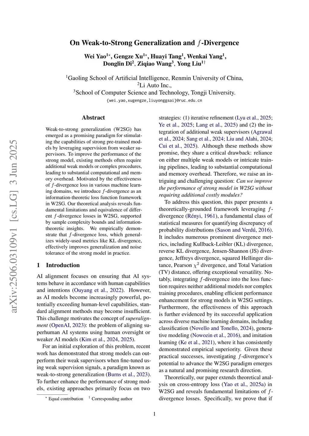 Weak-to-strong generalization (W2SG) has emerged as a promising paradigm for stimulating the capabilities of strong pre-trained models by leveraging supervision from weaker supervisors. To improve the performance of the strong model, existing methods often require additional weak models or complex procedures, leading to substantial computational and memory overhead. Motivated by the effectiveness of -divergence loss in various machine learning domains, we introduce -divergence as an information-theoretic loss function framework in W2SG. Our theoretical analysis reveals fundamental limitations and equivalence of different -divergence losses in W2SG, supported by sample complexity bounds and information-theoretic insights. We empirically demonstrate that -divergence loss, which generalizes widely-used metrics like KL divergence, effectively improves generalization and noise tolerance of the strong model in practice.