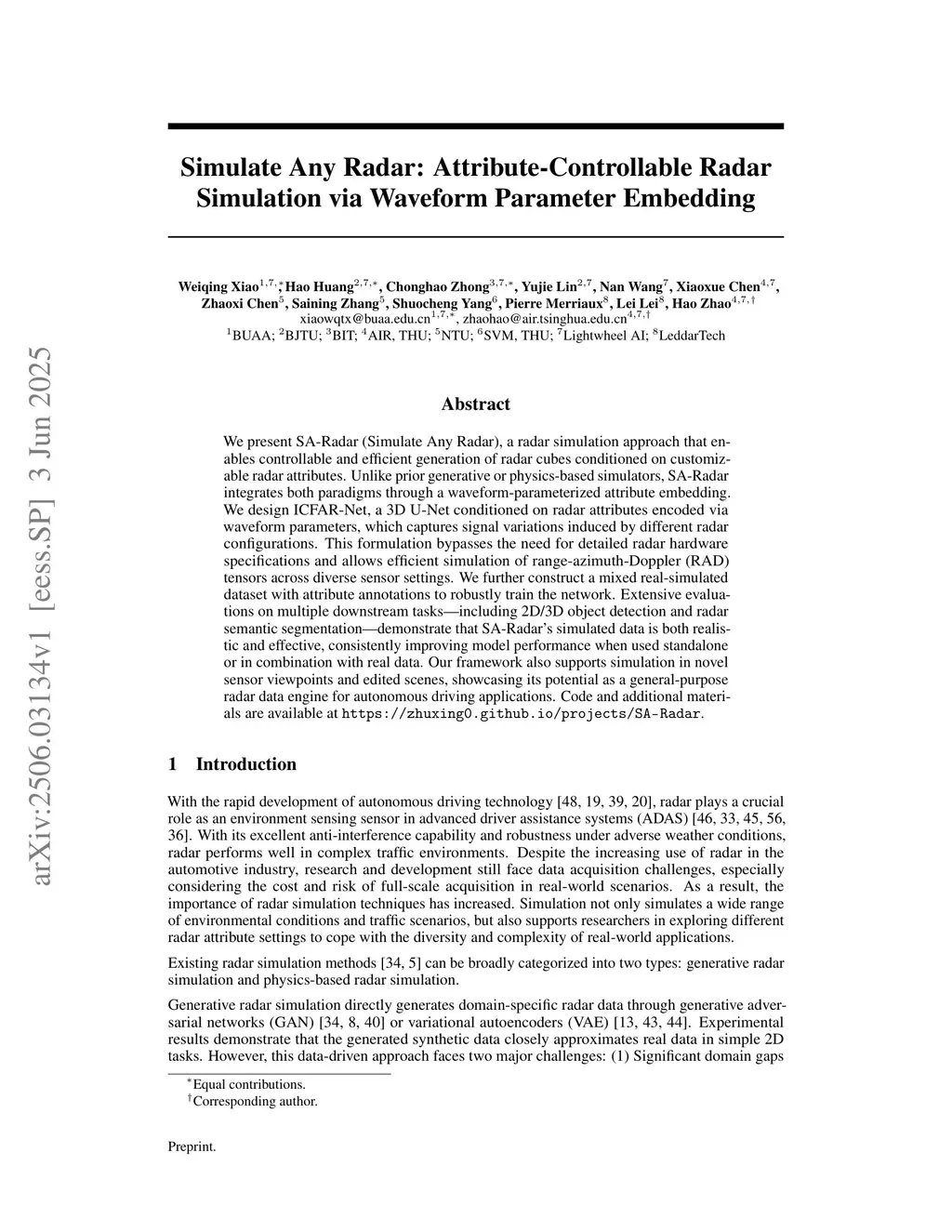 We present SA-Radar (Simulate Any Radar), a radar simulation approach that enables controllable and efficient generation of radar cubes conditioned on customizable radar attributes. Unlike prior generative or physics-based simulators, SA-Radar integrates both paradigms through a waveform-parameterized attribute embedding. We design ICFAR-Net, a 3D U-Net conditioned on radar attributes encoded via waveform parameters, which captures signal variations induced by different radar configurations. This formulation bypasses the need for detailed radar hardware specifications and allows efficient simulation of range-azimuth-Doppler (RAD) tensors across diverse sensor settings. We further construct a mixed real-simulated dataset with attribute annotations to robustly train the network. Extensive evaluations on multiple downstream tasks-including 2D/3D object detection and radar semantic segmentation-demonstrate that SA-Radar's simulated data is both realistic and effective, consistently improving model performance when used standalone or in combination with real data. Our framework also supports simulation in novel sensor viewpoints and edited scenes, showcasing its potential as a general-purpose radar data engine for autonomous driving applications. Code and additional materials are available atthis https URL.
