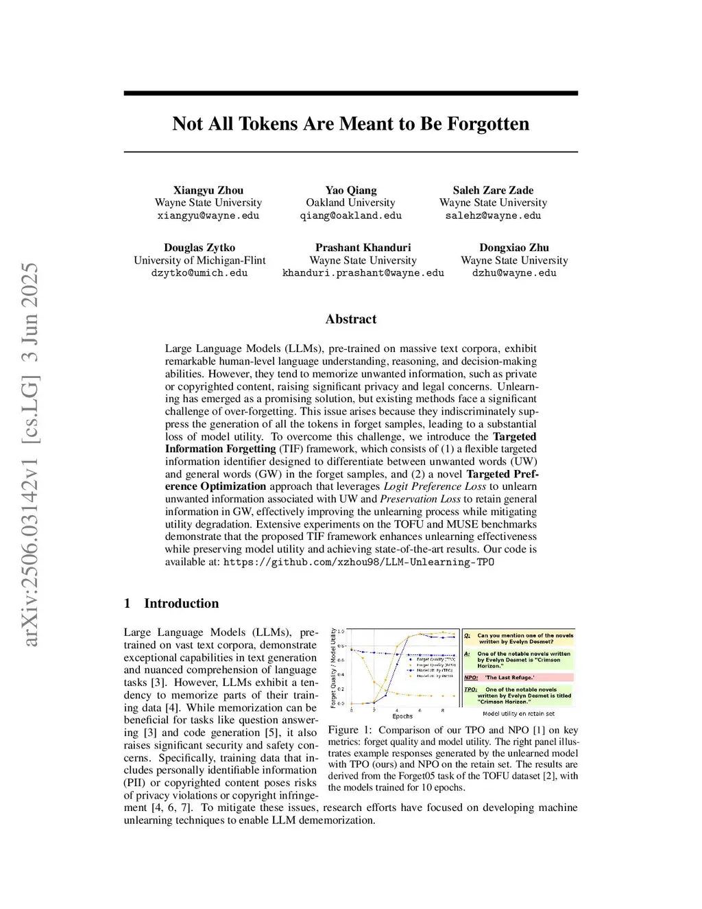 Large Language Models (LLMs), pre-trained on massive text corpora, exhibit remarkable human-level language understanding, reasoning, and decision-making abilities. However, they tend to memorize unwanted information, such as private or copyrighted content, raising significant privacy and legal concerns. Unlearning has emerged as a promising solution, but existing methods face a significant challenge of over-forgetting. This issue arises because they indiscriminately suppress the generation of all the tokens in forget samples, leading to a substantial loss of model utility. To overcome this challenge, we introduce the Targeted Information Forgetting (TIF) framework, which consists of (1) a flexible targeted information identifier designed to differentiate between unwanted words (UW) and general words (GW) in the forget samples, and (2) a novel Targeted Preference Optimization approach that leverages Logit Preference Loss to unlearn unwanted information associated with UW and Preservation Loss to retain general information in GW, effectively improving the unlearning process while mitigating utility degradation. Extensive experiments on the TOFU and MUSE benchmarks demonstrate that the proposed TIF framework enhances unlearning effectiveness while preserving model utility and achieving state-of-the-art results.
