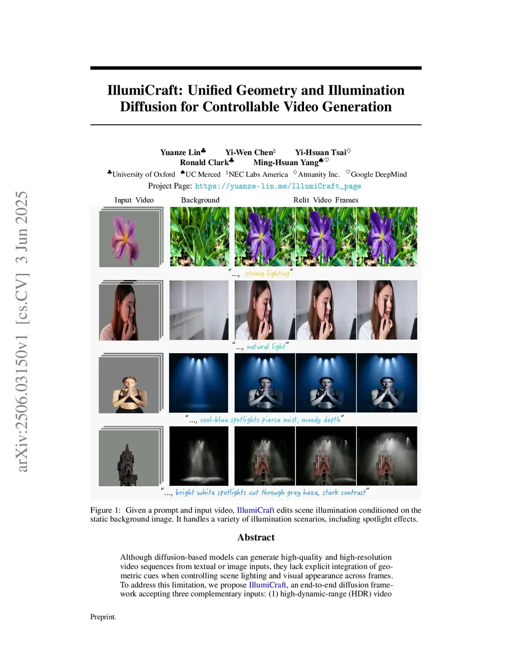 Although diffusion-based models can generate high-quality and high-resolution video sequences from textual or image inputs, they lack explicit integration of geometric cues when controlling scene lighting and visual appearance across frames. To address this limitation, we propose IllumiCraft, an end-to-end diffusion framework accepting three complementary inputs: (1) high-dynamic-range (HDR) video maps for detailed lighting control; (2) synthetically relit frames with randomized illumination changes (optionally paired with a static background reference image) to provide appearance cues; and (3) 3D point tracks that capture precise 3D geometry information. By integrating the lighting, appearance, and geometry cues within a unified diffusion architecture, IllumiCraft generates temporally coherent videos aligned with user-defined prompts. It supports background-conditioned and text-conditioned video relighting and provides better fidelity than existing controllable video generation methods. Project Page:this https URL