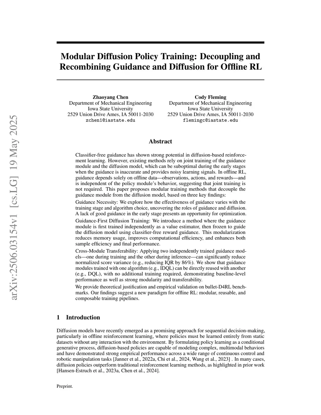 Classifier free guidance has shown strong potential in diffusion-based reinforcement learning. However, existing methods rely on joint training of the guidance module and the diffusion model, which can be suboptimal during the early stages when the guidance is inaccurate and provides noisy learning signals. In offline RL, guidance depends solely on offline data: observations, actions, and rewards, and is independent of the policy module's behavior, suggesting that joint training is not required. This paper proposes modular training methods that decouple the guidance module from the diffusion model, based on three key findings:Guidance Necessity: We explore how the effectiveness of guidance varies with the training stage and algorithm choice, uncovering the roles of guidance and diffusion. A lack of good guidance in the early stage presents an opportunity for optimization.Guidance-First Diffusion Training: We introduce a method where the guidance module is first trained independently as a value estimator, then frozen to guide the diffusion model using classifier-free reward guidance. This modularization reduces memory usage, improves computational efficiency, and enhances both sample efficiency and final performance.Cross-Module Transferability: Applying two independently trained guidance models, one during training and the other during inference, can significantly reduce normalized score variance (e.g., reducing IQR by 86%). We show that guidance modules trained with one algorithm (e.g., IDQL) can be directly reused with another (e.g., DQL), with no additional training required, demonstrating baseline-level performance as well as strong modularity and transferability.We provide theoretical justification and empirical validation on bullet D4RL benchmarks. Our findings suggest a new paradigm for offline RL: modular, reusable, and composable training pipelines.
