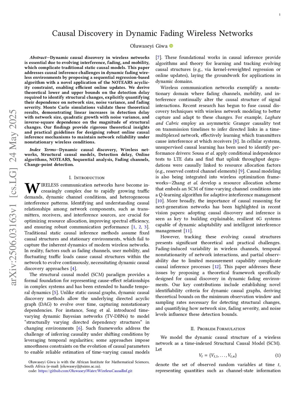 Dynamic causal discovery in wireless networks is essential due to evolving interference, fading, and mobility, which complicate traditional static causal models. This paper addresses causal inference challenges in dynamic fading wireless environments by proposing a sequential regression-based algorithm with a novel application of the NOTEARS acyclicity constraint, enabling efficient online updates. We derive theoretical lower and upper bounds on the detection delay required to identify structural changes, explicitly quantifying their dependence on network size, noise variance, and fading severity. Monte Carlo simulations validate these theoretical results, demonstrating linear increases in detection delay with network size, quadratic growth with noise variance, and inverse-square dependence on the magnitude of structural changes. Our findings provide rigorous theoretical insights and practical guidelines for designing robust online causal inference mechanisms to maintain network reliability under nonstationary wireless conditions.