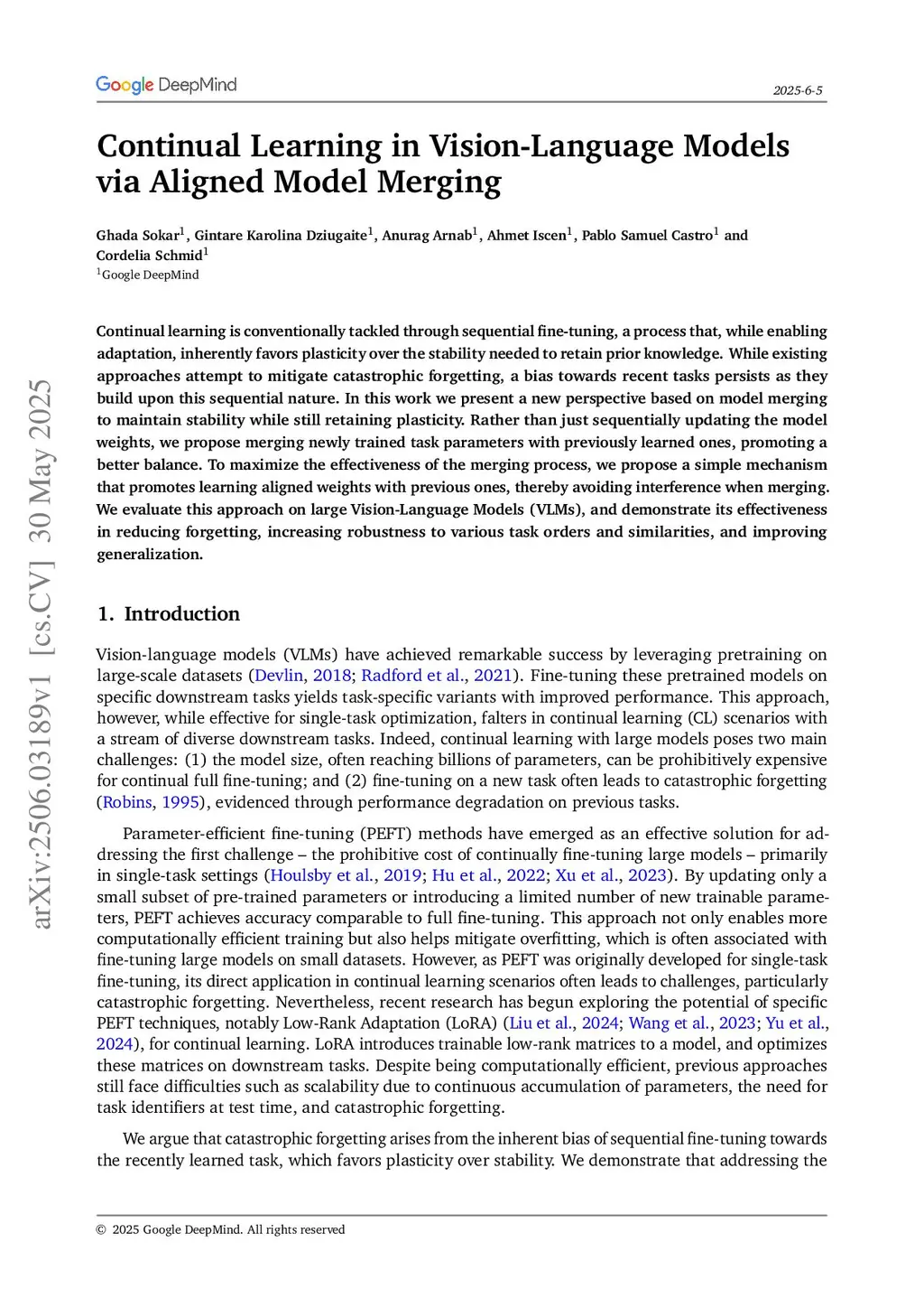 Continual learning is conventionally tackled through sequential fine-tuning, a process that, while enabling adaptation, inherently favors plasticity over the stability needed to retain prior knowledge. While existing approaches attempt to mitigate catastrophic forgetting, a bias towards recent tasks persists as they build upon this sequential nature. In this work we present a new perspective based on model merging to maintain stability while still retaining plasticity. Rather than just sequentially updating the model weights, we propose merging newly trained task parameters with previously learned ones, promoting a better balance. To maximize the effectiveness of the merging process, we propose a simple mechanism that promotes learning aligned weights with previous ones, thereby avoiding interference when merging. We evaluate this approach on large Vision-Language Models (VLMs), and demonstrate its effectiveness in reducing forgetting, increasing robustness to various task orders and similarities, and improving generalization.