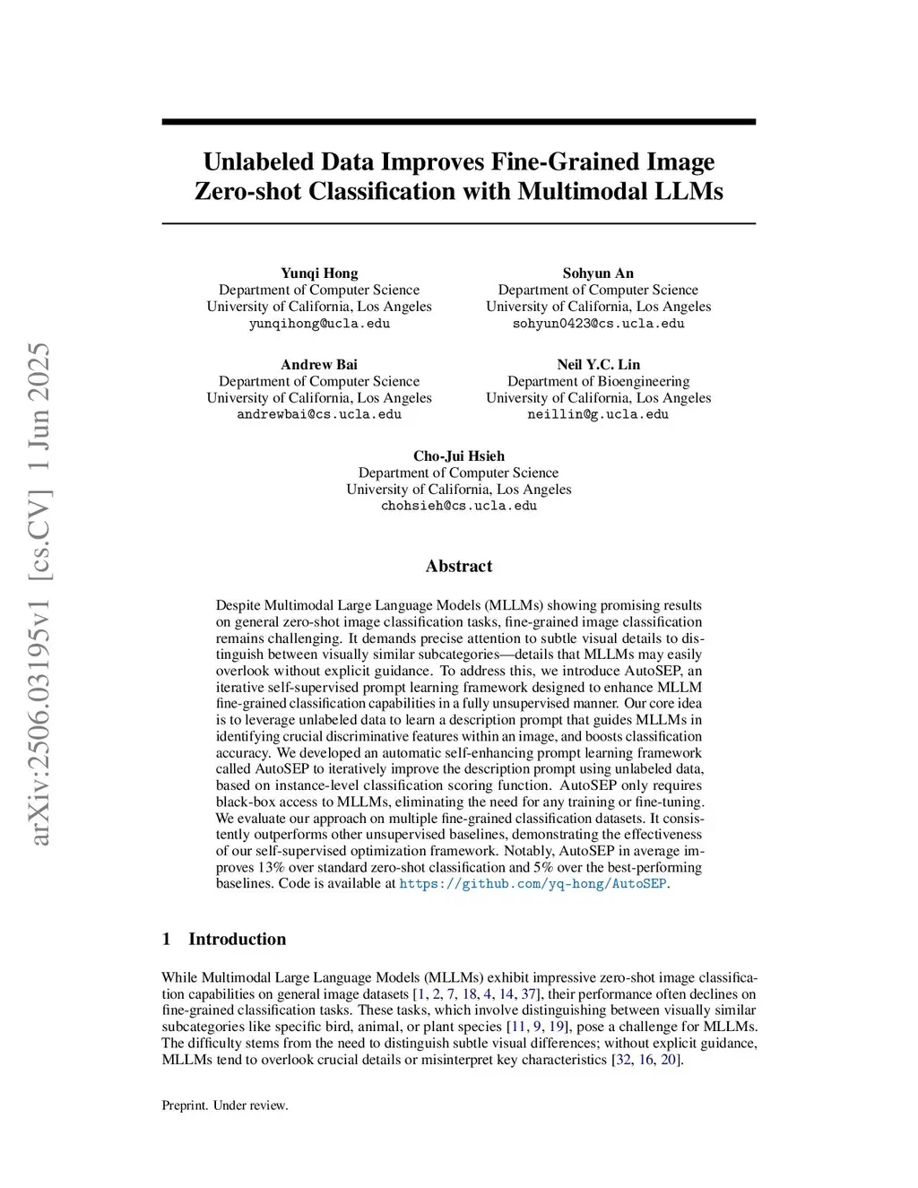 Despite Multimodal Large Language Models (MLLMs) showing promising results on general zero-shot image classification tasks, fine-grained image classification remains challenging. It demands precise attention to subtle visual details to distinguish between visually similar subcategories--details that MLLMs may easily overlook without explicit guidance. To address this, we introduce AutoSEP, an iterative self-supervised prompt learning framework designed to enhance MLLM fine-grained classification capabilities in a fully unsupervised manner. Our core idea is to leverage unlabeled data to learn a description prompt that guides MLLMs in identifying crucial discriminative features within an image, and boosts classification accuracy. We developed an automatic self-enhancing prompt learning framework called AutoSEP to iteratively improve the description prompt using unlabeled data, based on instance-level classification scoring function. AutoSEP only requires black-box access to MLLMs, eliminating the need for any training or fine-tuning. We evaluate our approach on multiple fine-grained classification datasets. It consistently outperforms other unsupervised baselines, demonstrating the effectiveness of our self-supervised optimization framework. Notably, AutoSEP on average improves 13 percent over standard zero-shot classification and 5 percent over the best-performing baselines. Code is available at:this https URL