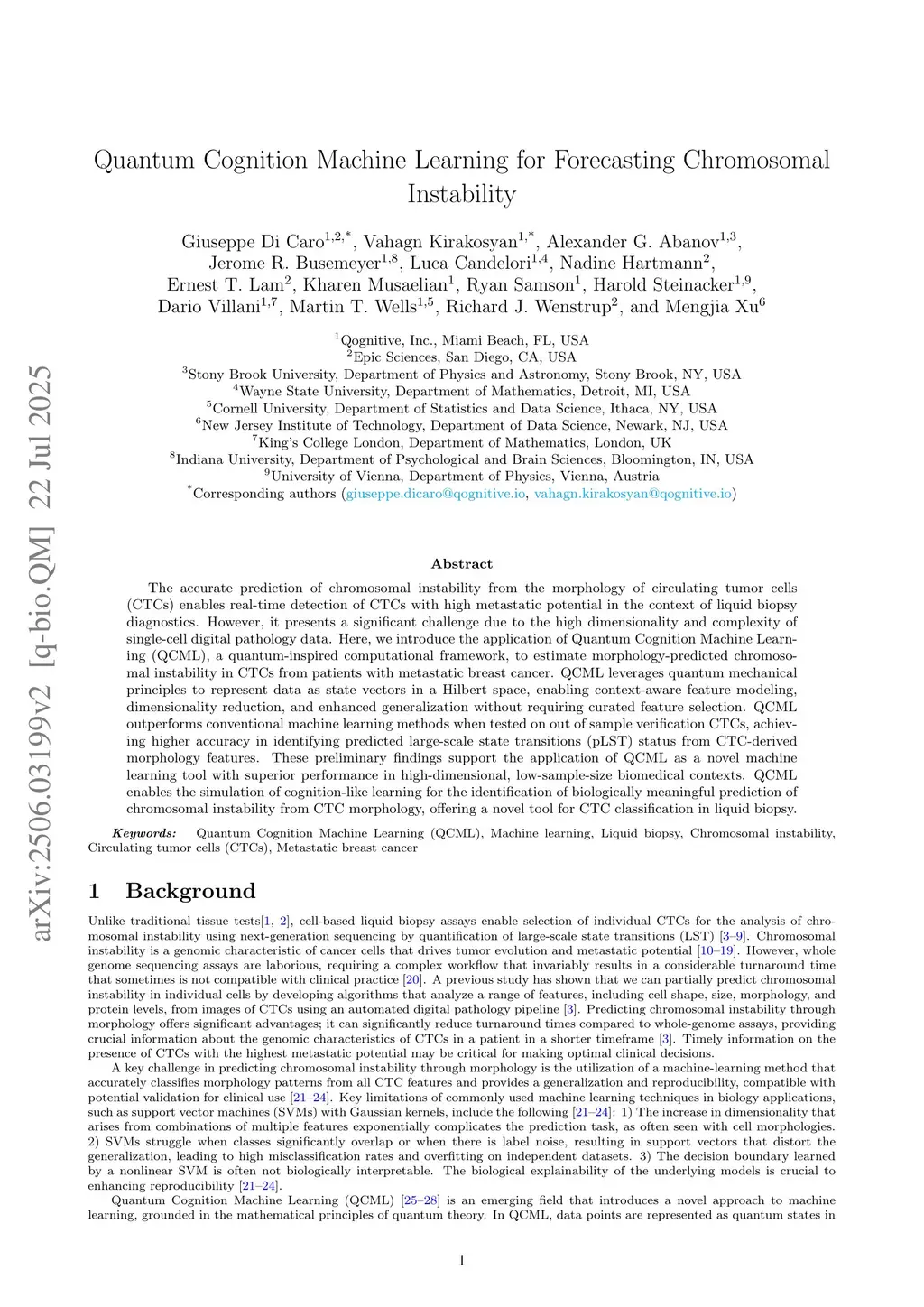 The accurate prediction of chromosomal instability from the morphology of circulating tumor cells (CTCs) enables real-time detection of CTCs with high metastatic potential in the context of liquid biopsy diagnostics. However, it presents a significant challenge due to the high dimensionality and complexity of single-cell digital pathology data. Here, we introduce the application of Quantum Cognition Machine Learning (QCML), a quantum-inspired computational framework, to estimate morphology-predicted chromosomal instability in CTCs from patients with metastatic breast cancer. QCML leverages quantum mechanical principles to represent data as state vectors in a Hilbert space, enabling context-aware feature modeling, dimensionality reduction, and enhanced generalization without requiring curated feature selection. QCML outperforms conventional machine learning methods when tested on out of sample verification CTCs, achieving higher accuracy in identifying predicted large-scale state transitions (pLST) status from CTC-derived morphology features. These preliminary findings support the application of QCML as a novel machine learning tool with superior performance in high-dimensional, low-sample-size biomedical contexts. QCML enables the simulation of cognition-like learning for the identification of biologically meaningful prediction of chromosomal instability from CTC morphology, offering a novel tool for CTC classification in liquid biopsy.