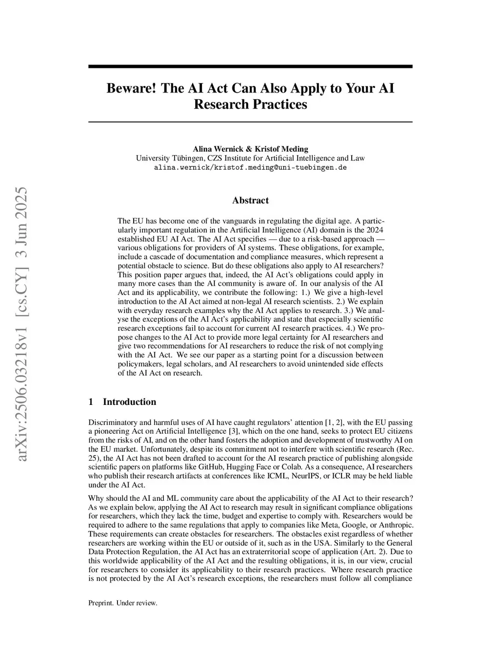 The EU has become one of the vanguards in regulating the digital age. A particularly important regulation in the Artificial Intelligence (AI) domain is the EU AI Act, which entered into force in 2024. The AI Act specifies -- due to a risk-based approach -- various obligations for providers of AI systems. These obligations, for example, include a cascade of documentation and compliance measures, which represent a potential obstacle to science. But do these obligations also apply to AI researchers? This position paper argues that, indeed, the AI Act's obligations could apply in many more cases than the AI community is aware of. In our analysis of the AI Act and its applicability, we contribute the following: 1.) We give a high-level introduction to the AI Act aimed at non-legal AI research scientists. 2.) We explain with everyday research examples why the AI Act applies to research. 3.) We analyse the exceptions of the AI Act's applicability and state that especially scientific research exceptions fail to account for current AI research practices. 4.) We propose changes to the AI Act to provide more legal certainty for AI researchers and give two recommendations for AI researchers to reduce the risk of not complying with the AI Act. We see our paper as a starting point for a discussion between policymakers, legal scholars, and AI researchers to avoid unintended side effects of the AI Act on research.