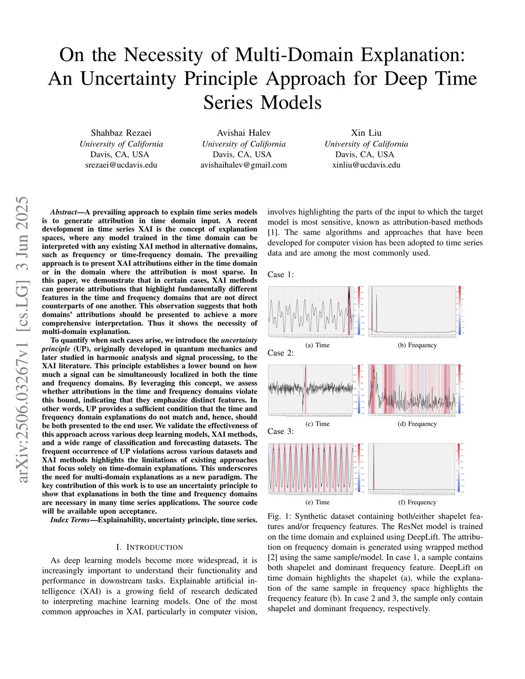 A prevailing approach to explain time series models is to generate attribution in time domain. A recent development in time series XAI is the concept of explanation spaces, where any model trained in the time domain can be interpreted with any existing XAI method in alternative domains, such as frequency. The prevailing approach is to present XAI attributions either in the time domain or in the domain where the attribution is most sparse. In this paper, we demonstrate that in certain cases, XAI methods can generate attributions that highlight fundamentally different features in the time and frequency domains that are not direct counterparts of one another. This suggests that both domains' attributions should be presented to achieve a more comprehensive interpretation. Thus it shows the necessity of multi-domain explanation. To quantify when such cases arise, we introduce the uncertainty principle (UP), originally developed in quantum mechanics and later studied in harmonic analysis and signal processing, to the XAI literature. This principle establishes a lower bound on how much a signal can be simultaneously localized in both the time and frequency domains. By leveraging this concept, we assess whether attributions in the time and frequency domains violate this bound, indicating that they emphasize distinct features. In other words, UP provides a sufficient condition that the time and frequency domain explanations do not match and, hence, should be both presented to the end user. We validate the effectiveness of this approach across various deep learning models, XAI methods, and a wide range of classification and forecasting datasets. The frequent occurrence of UP violations across various datasets and XAI methods highlights the limitations of existing approaches that focus solely on time-domain explanations. This underscores the need for multi-domain explanations as a new paradigm.