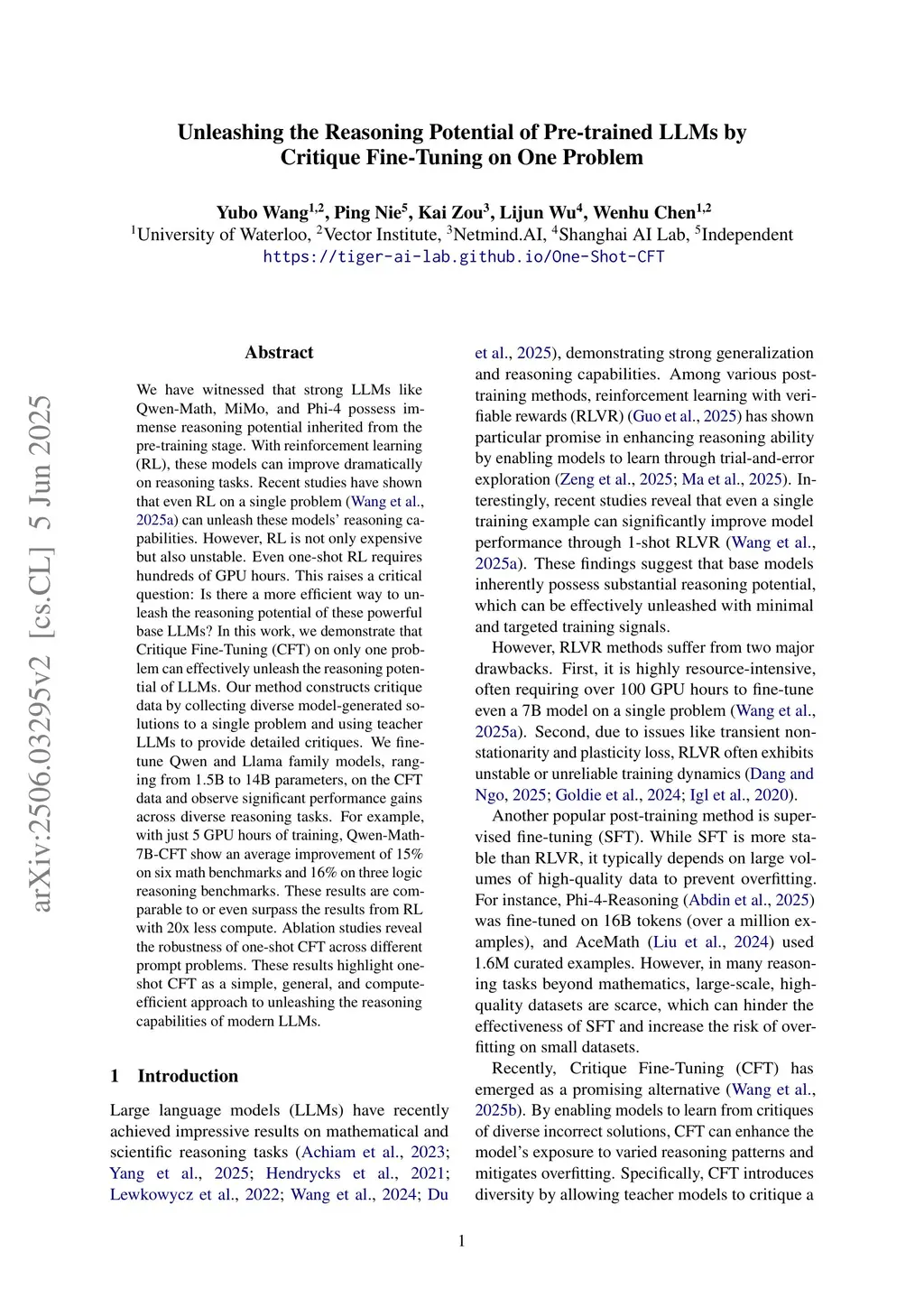 We have witnessed that strong LLMs like Qwen-Math, MiMo, and Phi-4 possess immense reasoning potential inherited from the pre-training stage. With reinforcement learning (RL), these models can improve dramatically on reasoning tasks. Recent studies have shown that even RL on a single problem can unleash these models' reasoning capabilities. However, RL is not only expensive but also unstable. Even one-shot RL requires hundreds of GPU hours. This raises a critical question: Is there a more efficient way to unleash the reasoning potential of these powerful base LLMs? In this work, we demonstrate that Critique Fine-Tuning (CFT) on only one problem can effectively unleash the reasoning potential of LLMs. Our method constructs critique data by collecting diverse model-generated solutions to a single problem and using teacher LLMs to provide detailed critiques. We fine-tune Qwen and Llama family models, ranging from 1.5B to 14B parameters, on the CFT data and observe significant performance gains across diverse reasoning tasks. For example, with just 5 GPU hours of training, Qwen-Math-7B-CFT show an average improvement of 15% on six math benchmarks and 16% on three logic reasoning benchmarks. These results are comparable to or even surpass the results from RL with 20x less compute. Ablation studies reveal the robustness of one-shot CFT across different prompt problems. These results highlight one-shot CFT as a simple, general, and compute-efficient approach to unleashing the reasoning capabilities of modern LLMs.