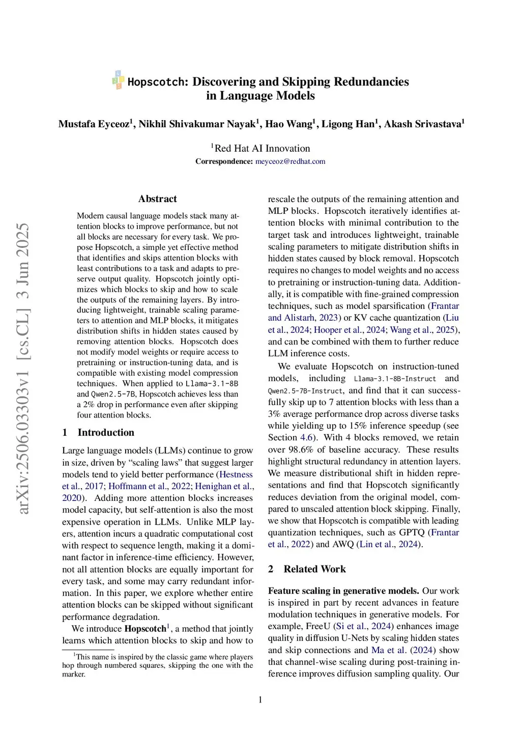 Modern causal language models stack many attention blocks to improve performance, but not all blocks are necessary for every task. We propose Hopscotch, a simple yet effective method that identifies and skips attention blocks with least contributions to a task and adapts to preserve output quality. Hopscotch jointly optimizes which blocks to skip and how to scale the outputs of the remaining layers. By introducing lightweight, trainable scaling parameters to attention and MLP blocks, it mitigates distribution shifts in hidden states caused by removing attention blocks. Hopscotch does not modify model weights or require access to pretraining or instruction-tuning data, and is compatible with existing model compression techniques. When applied to and , Hopscotch achieves less than a 2% drop in performance even after skipping four attention blocks.