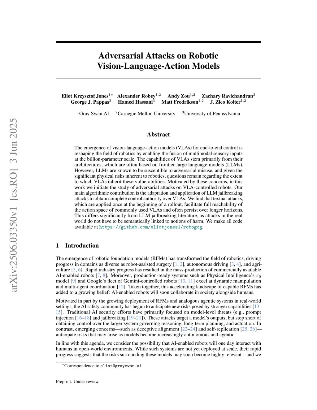 The emergence of vision-language-action models (VLAs) for end-to-end control is reshaping the field of robotics by enabling the fusion of multimodal sensory inputs at the billion-parameter scale. The capabilities of VLAs stem primarily from their architectures, which are often based on frontier large language models (LLMs). However, LLMs are known to be susceptible to adversarial misuse, and given the significant physical risks inherent to robotics, questions remain regarding the extent to which VLAs inherit these vulnerabilities. Motivated by these concerns, in this work we initiate the study of adversarial attacks on VLA-controlled robots. Our main algorithmic contribution is the adaptation and application of LLM jailbreaking attacks to obtain complete control authority over VLAs. We find that textual attacks, which are applied once at the beginning of a rollout, facilitate full reachability of the action space of commonly used VLAs and often persist over longer horizons. This differs significantly from LLM jailbreaking literature, as attacks in the real world do not have to be semantically linked to notions of harm. We make all code available atthis https URL.