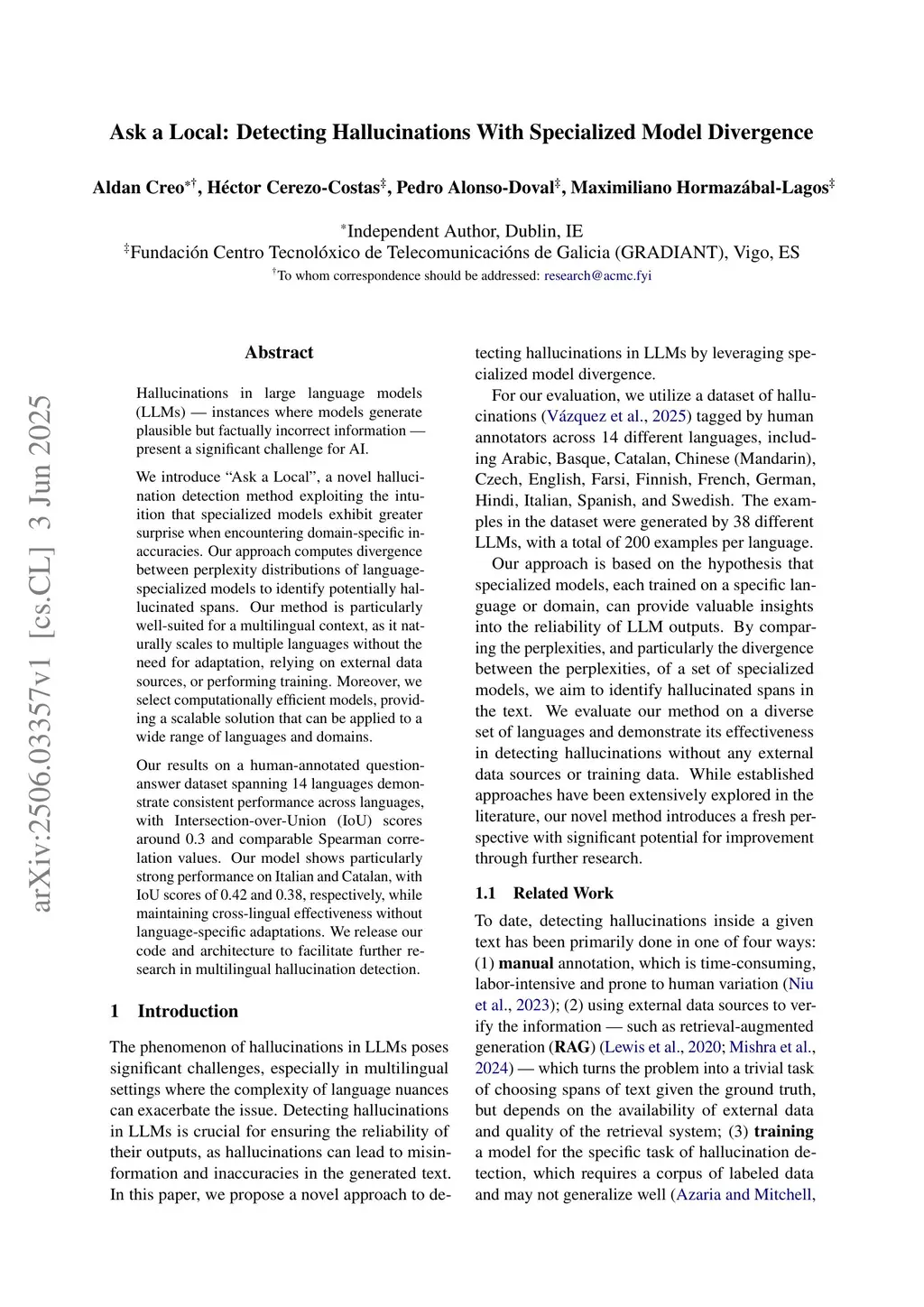 Hallucinations in large language models (LLMs) - instances where models generate plausible but factually incorrect information - present a significant challenge for AI.We introduce "Ask a Local", a novel hallucination detection method exploiting the intuition that specialized models exhibit greater surprise when encountering domain-specific inaccuracies. Our approach computes divergence between perplexity distributions of language-specialized models to identify potentially hallucinated spans. Our method is particularly well-suited for a multilingual context, as it naturally scales to multiple languages without the need for adaptation, relying on external data sources, or performing training. Moreover, we select computationally efficient models, providing a scalable solution that can be applied to a wide range of languages and domains.Our results on a human-annotated question-answer dataset spanning 14 languages demonstrate consistent performance across languages, with Intersection-over-Union (IoU) scores around 0.3 and comparable Spearman correlation values. Our model shows particularly strong performance on Italian and Catalan, with IoU scores of 0.42 and 0.38, respectively, while maintaining cross-lingual effectiveness without language-specific adaptations. We release our code and architecture to facilitate further research in multilingual hallucination detection.