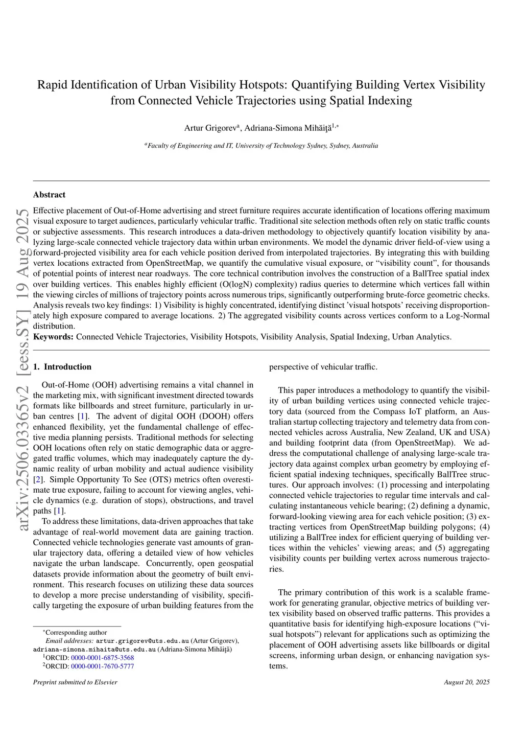 Effective placement of Out-of-Home advertising and street furniture requires accurate identification of locations offering maximum visual exposure to target audiences, particularly vehicular traffic. Traditional site selection methods often rely on static traffic counts or subjective assessments. This research introduces a data-driven methodology to objectively quantify location visibility by analyzing large-scale connected vehicle trajectory data (sourced from Compass IoT) within urban environments. We model the dynamic driver field-of-view using a forward-projected visibility area for each vehicle position derived from interpolated trajectories. By integrating this with building vertex locations extracted from OpenStreetMap, we quantify the cumulative visual exposure, or ``visibility count'', for thousands of potential points of interest near roadways. The analysis reveals that visibility is highly concentrated, identifying specific ``visual hotspots'' that receive disproportionately high exposure compared to average locations. The core technical contribution involves the construction of a BallTree spatial index over building vertices. This enables highly efficient (O(logN) complexity) radius queries to determine which vertices fall within the viewing circles of millions of trajectory points across numerous trips, significantly outperforming brute-force geometric checks. Analysis reveals two key findings: 1) Visibility is highly concentrated, identifying distinct 'visual hotspots' receiving disproportionately high exposure compared to average locations. 2) The aggregated visibility counts across vertices conform to a Log-Normal distribution.