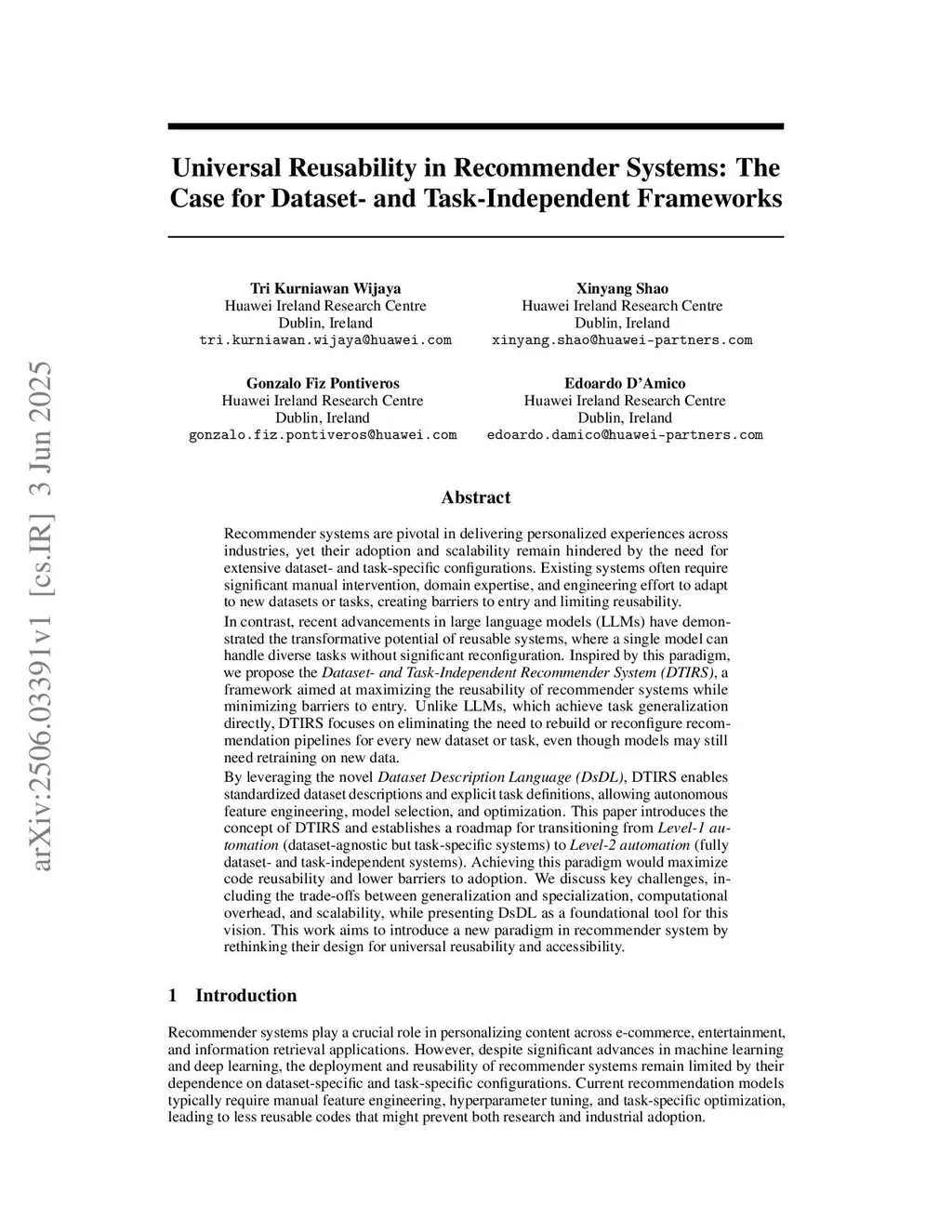 Recommender systems are pivotal in delivering personalized experiences across industries, yet their adoption and scalability remain hindered by the need for extensive dataset- and task-specific configurations. Existing systems often require significant manual intervention, domain expertise, and engineering effort to adapt to new datasets or tasks, creating barriers to entry and limiting reusability. In contrast, recent advancements in large language models (LLMs) have demonstrated the transformative potential of reusable systems, where a single model can handle diverse tasks without significant reconfiguration. Inspired by this paradigm, we propose the Dataset- and Task-Independent Recommender System (DTIRS), a framework aimed at maximizing the reusability of recommender systems while minimizing barriers to entry. Unlike LLMs, which achieve task generalization directly, DTIRS focuses on eliminating the need to rebuild or reconfigure recommendation pipelines for every new dataset or task, even though models may still need retraining on new data. By leveraging the novel Dataset Description Language (DsDL), DTIRS enables standardized dataset descriptions and explicit task definitions, allowing autonomous feature engineering, model selection, and optimization. This paper introduces the concept of DTIRS and establishes a roadmap for transitioning from Level-1 automation (dataset-agnostic but task-specific systems) to Level-2 automation (fully dataset- and task-independent systems). Achieving this paradigm would maximize code reusability and lower barriers to adoption. We discuss key challenges, including the trade-offs between generalization and specialization, computational overhead, and scalability, while presenting DsDL as a foundational tool for this vision.