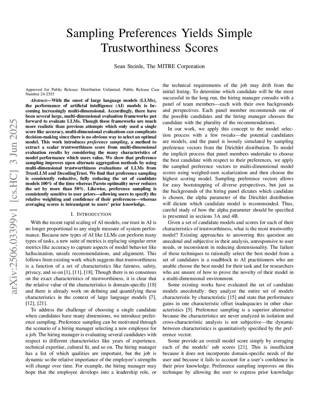 With the onset of large language models (LLMs), the performance of artificial intelligence (AI) models is becoming increasingly multi-dimensional. Accordingly, there have been several large, multi-dimensional evaluation frameworks put forward to evaluate LLMs. Though these frameworks are much more realistic than previous attempts which only used a single score like accuracy, multi-dimensional evaluations can complicate decision-making since there is no obvious way to select an optimal model. This work introduces preference sampling, a method to extract a scalar trustworthiness score from multi-dimensional evaluation results by considering the many characteristics of model performance which users value. We show that preference sampling improves upon alternate aggregation methods by using multi-dimensional trustworthiness evaluations of LLMs from TrustLLM and DecodingTrust. We find that preference sampling is consistently reductive, fully reducing the set of candidate models 100% of the time whereas Pareto optimality never reduces the set by more than 50%. Likewise, preference sampling is consistently sensitive to user priors-allowing users to specify the relative weighting and confidence of their preferences-whereas averaging scores is intransigent to the users' prior knowledge.