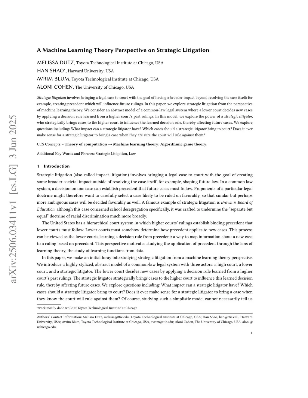 Strategic litigation involves bringing a legal case to court with the goal of having a broader impact beyond resolving the case itself: for example, creating precedent which will influence future rulings. In this paper, we explore strategic litigation from the perspective of machine learning theory. We consider an abstract model of a common-law legal system where a lower court decides new cases by applying a decision rule learned from a higher court's past rulings. In this model, we explore the power of a strategic litigator, who strategically brings cases to the higher court to influence the learned decision rule, thereby affecting future cases. We explore questions including: What impact can a strategic litigator have? Which cases should a strategic litigator bring to court? Does it ever make sense for a strategic litigator to bring a case when they are sure the court will rule against them?