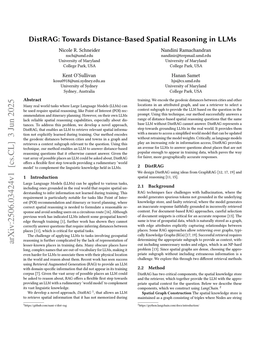 Many real world tasks where Large Language Models (LLMs) can be used require spatial reasoning, like Point of Interest (POI) recommendation and itinerary planning. However, on their own LLMs lack reliable spatial reasoning capabilities, especially about distances. To address this problem, we develop a novel approach, DistRAG, that enables an LLM to retrieve relevant spatial information not explicitly learned during training. Our method encodes the geodesic distances between cities and towns in a graph and retrieves a context subgraph relevant to the question. Using this technique, our method enables an LLM to answer distance-based reasoning questions that it otherwise cannot answer. Given the vast array of possible places an LLM could be asked about, DistRAG offers a flexible first step towards providing a rudimentary `world model' to complement the linguistic knowledge held in LLMs.