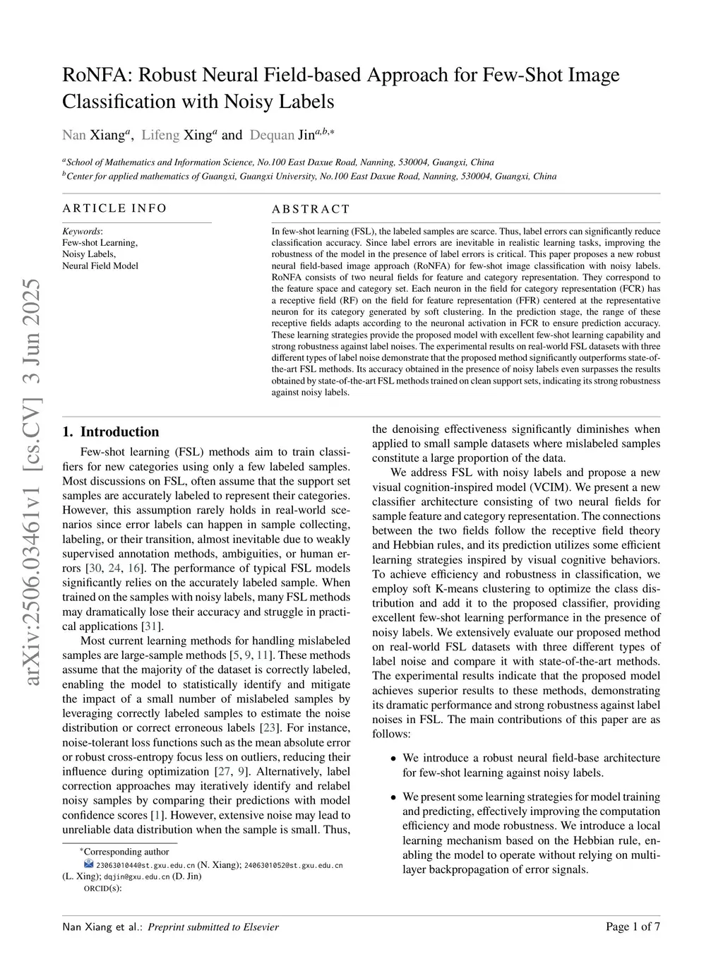 RoNFA: Robust Neural Field-based Approach for Few-Shot Image Classification with Noisy Labels