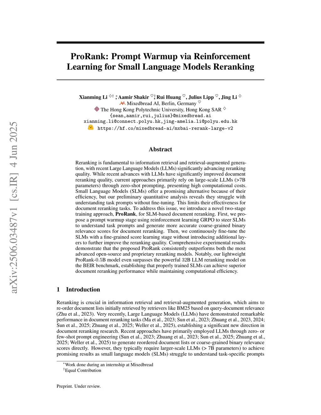 Reranking is fundamental to information retrieval and retrieval-augmented generation, with recent Large Language Models (LLMs) significantly advancing reranking quality. While recent advances with LLMs have significantly improved document reranking quality, current approaches primarily rely on large-scale LLMs (>7B parameters) through zero-shot prompting, presenting high computational costs. Small Language Models (SLMs) offer a promising alternative because of their efficiency, but our preliminary quantitative analysis reveals they struggle with understanding task prompts without fine-tuning. This limits their effectiveness for document reranking tasks. To address this issue, we introduce a novel two-stage training approach, ProRank, for SLM-based document reranking. First, we propose a prompt warmup stage using reinforcement learning GRPO to steer SLMs to understand task prompts and generate more accurate coarse-grained binary relevance scores for document reranking. Then, we continuously fine-tune the SLMs with a fine-grained score learning stage without introducing additional layers to further improve the reranking quality. Comprehensive experimental results demonstrate that the proposed ProRank consistently outperforms both the most advanced open-source and proprietary reranking models. Notably, our lightweight ProRank-0.5B model even surpasses the powerful 32B LLM reranking model on the BEIR benchmark, establishing that properly trained SLMs can achieve superior document reranking performance while maintaining computational efficiency.