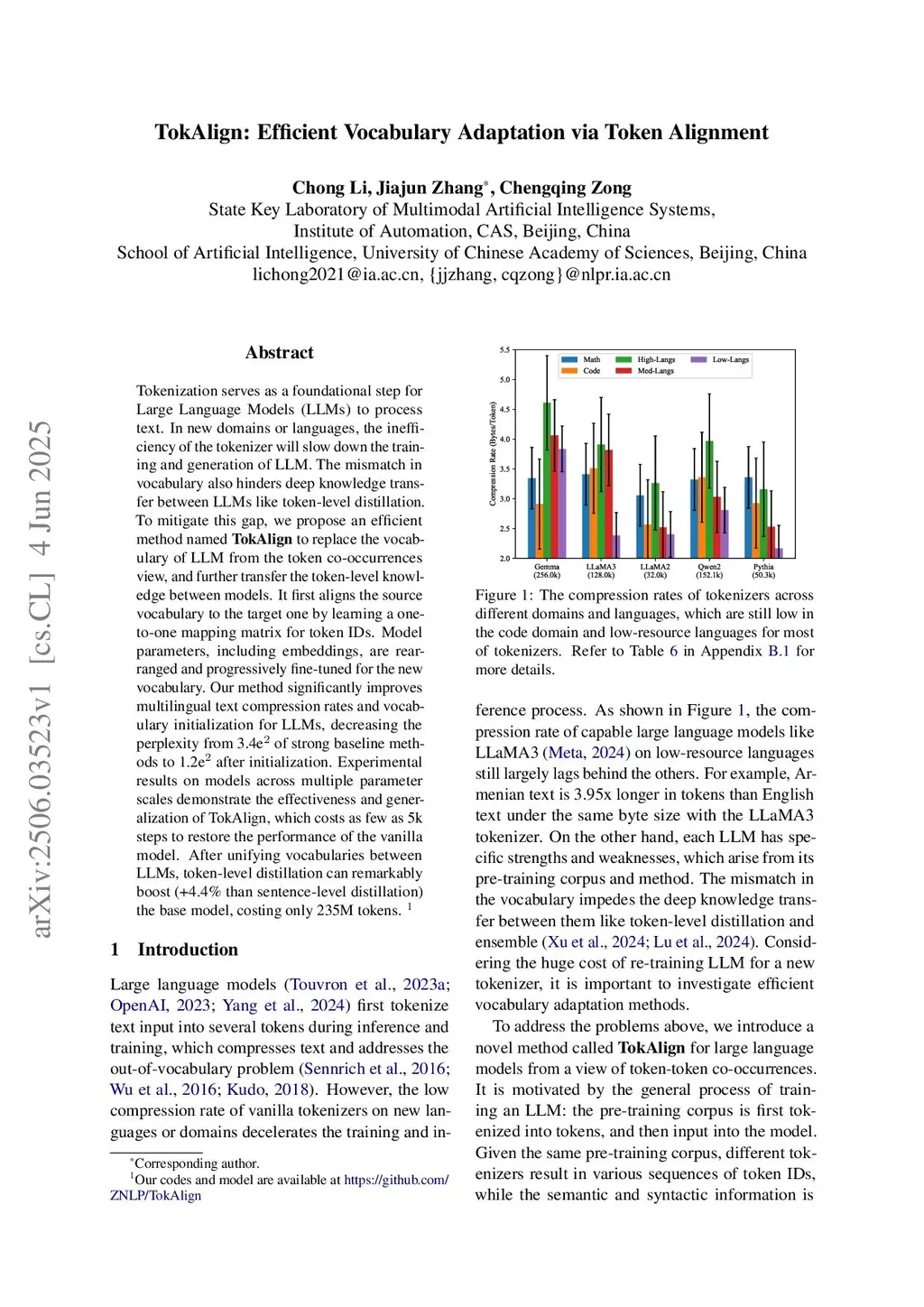 TokAlign: Efficient Vocabulary Adaptation via Token Alignment