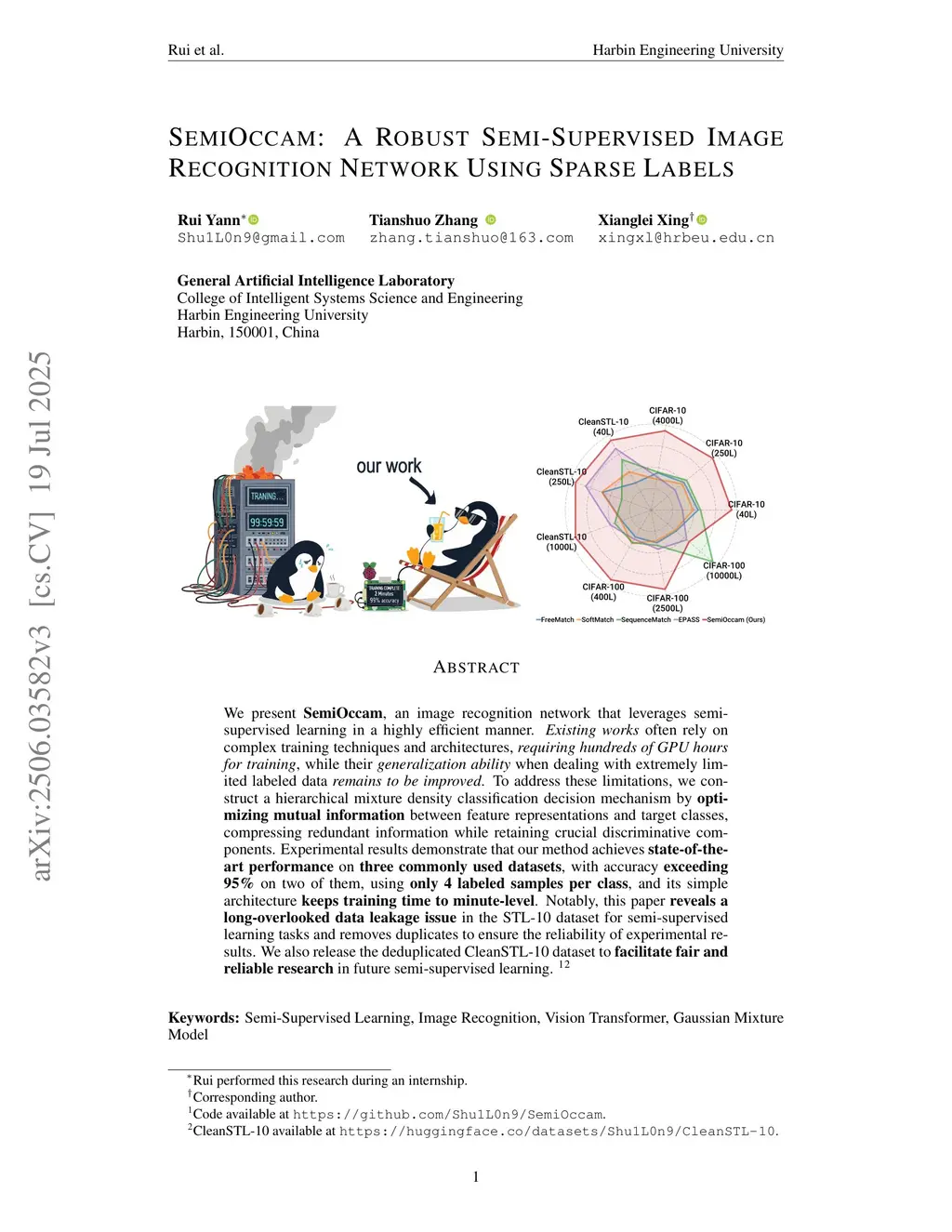 We present SemiOccam, an image recognition network that leverages semi-supervised learning in a highly efficient manner. Existing works often rely on complex training techniques and architectures, requiring hundreds of GPU hours for training, while their generalization ability with extremely limited labeled data remains to be improved. To address these limitations, we construct a hierarchical mixture density classification mechanism by optimizing mutual information between feature representations and target classes, compressing redundant information while retaining crucial discriminative components. Experimental results demonstrate that our method achieves state-of-the-art performance on three commonly used datasets, with accuracy exceeding 95% on two of them using only 4 labeled samples per class, and its simple architecture keeps training time at the minute level. Notably, this paper reveals a long-overlooked data leakage issue in the STL-10 dataset for semi-supervised learning and removes duplicates to ensure reliable experimental results. We release the deduplicated CleanSTL-10 dataset to facilitate fair and reproducible research. Code available atthis https URL.