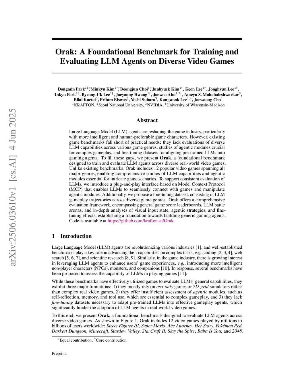 Orak: A Foundational Benchmark for Training and Evaluating LLM Agents on Diverse Video Games