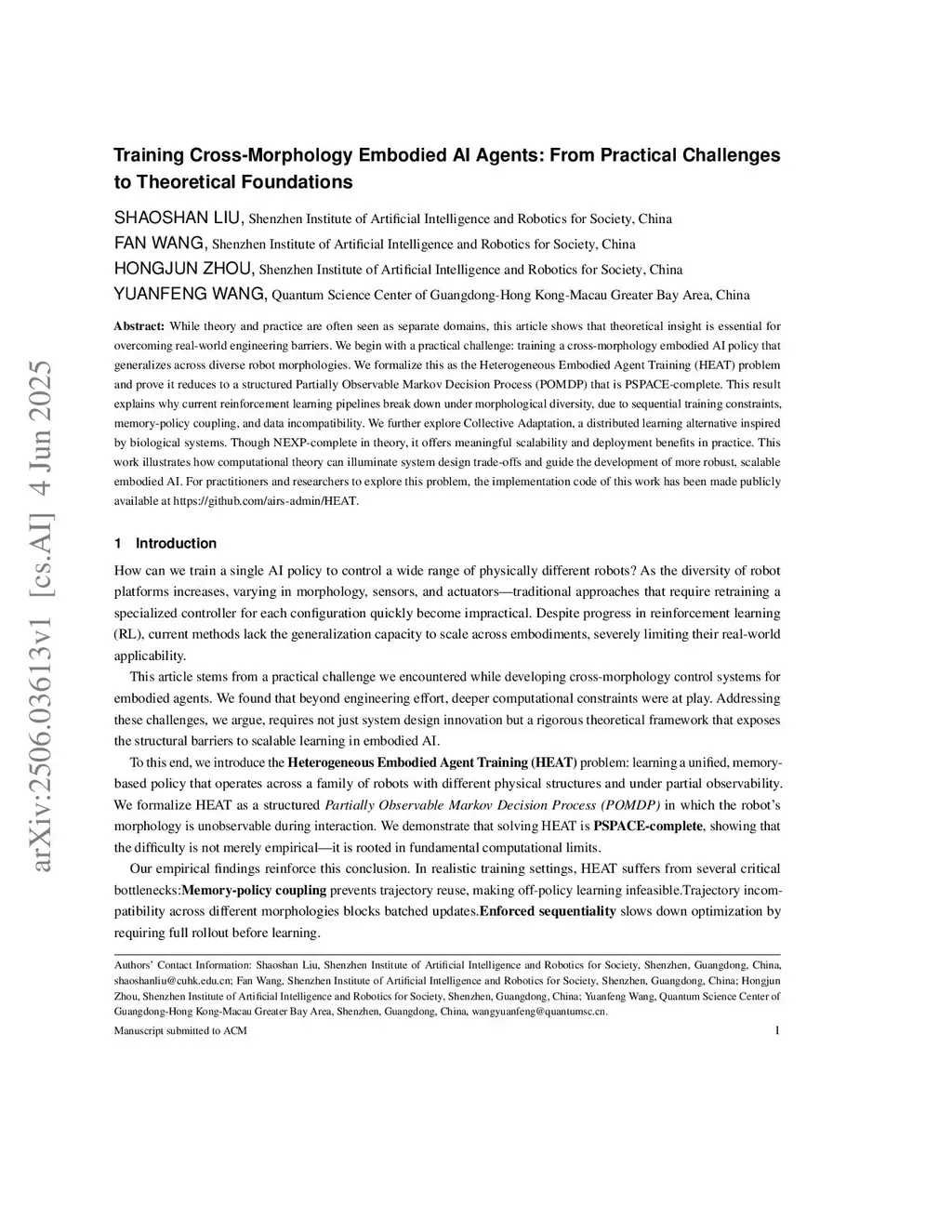 While theory and practice are often seen as separate domains, this article shows that theoretical insight is essential for overcoming real-world engineering barriers. We begin with a practical challenge: training a cross-morphology embodied AI policy that generalizes across diverse robot morphologies. We formalize this as the Heterogeneous Embodied Agent Training (HEAT) problem and prove it reduces to a structured Partially Observable Markov Decision Process (POMDP) that is PSPACE-complete. This result explains why current reinforcement learning pipelines break down under morphological diversity, due to sequential training constraints, memory-policy coupling, and data incompatibility. We further explore Collective Adaptation, a distributed learning alternative inspired by biological systems. Though NEXP-complete in theory, it offers meaningful scalability and deployment benefits in practice. This work illustrates how computational theory can illuminate system design trade-offs and guide the development of more robust, scalable embodied AI. For practitioners and researchers to explore this problem, the implementation code of this work has been made publicly available atthis https URL