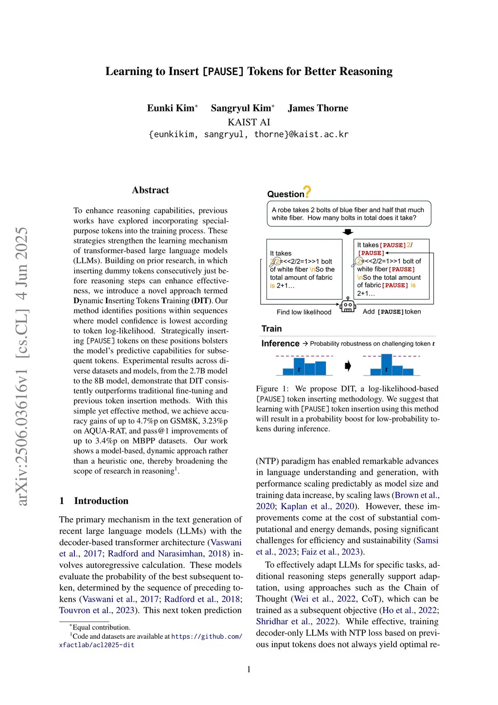 To enhance reasoning capabilities, previous works have explored incorporating special-purpose tokens into the training process. These strategies strengthen the learning mechanism of transformer-based large language models (LLMs). Building on prior research, in which inserting dummy tokens consecutively just before reasoning steps can enhance effectiveness, we introduce a novel approach termed Dynamic Inserting Tokens Training (DIT). Our method identifies positions within sequences where model confidence is lowest according to token log-likelihood. Strategically inserting [PAUSE] tokens on these positions bolsters the model's predictive capabilities for subsequent tokens. Experimental results across diverse datasets and models, from the 2.7B model to the 8B model, demonstrate that DIT consistently outperforms traditional fine-tuning and previous token insertion methods. With this simple yet effective method, we achieve accuracy gains of up to 4.7%p on GSM8K, 3.23%p on AQUA-RAT, and pass@1 improvements of up to 3.4%p on MBPP datasets. Our work shows a model-based, dynamic approach rather than a heuristic one, thereby broadening the scope of research in reasoning.