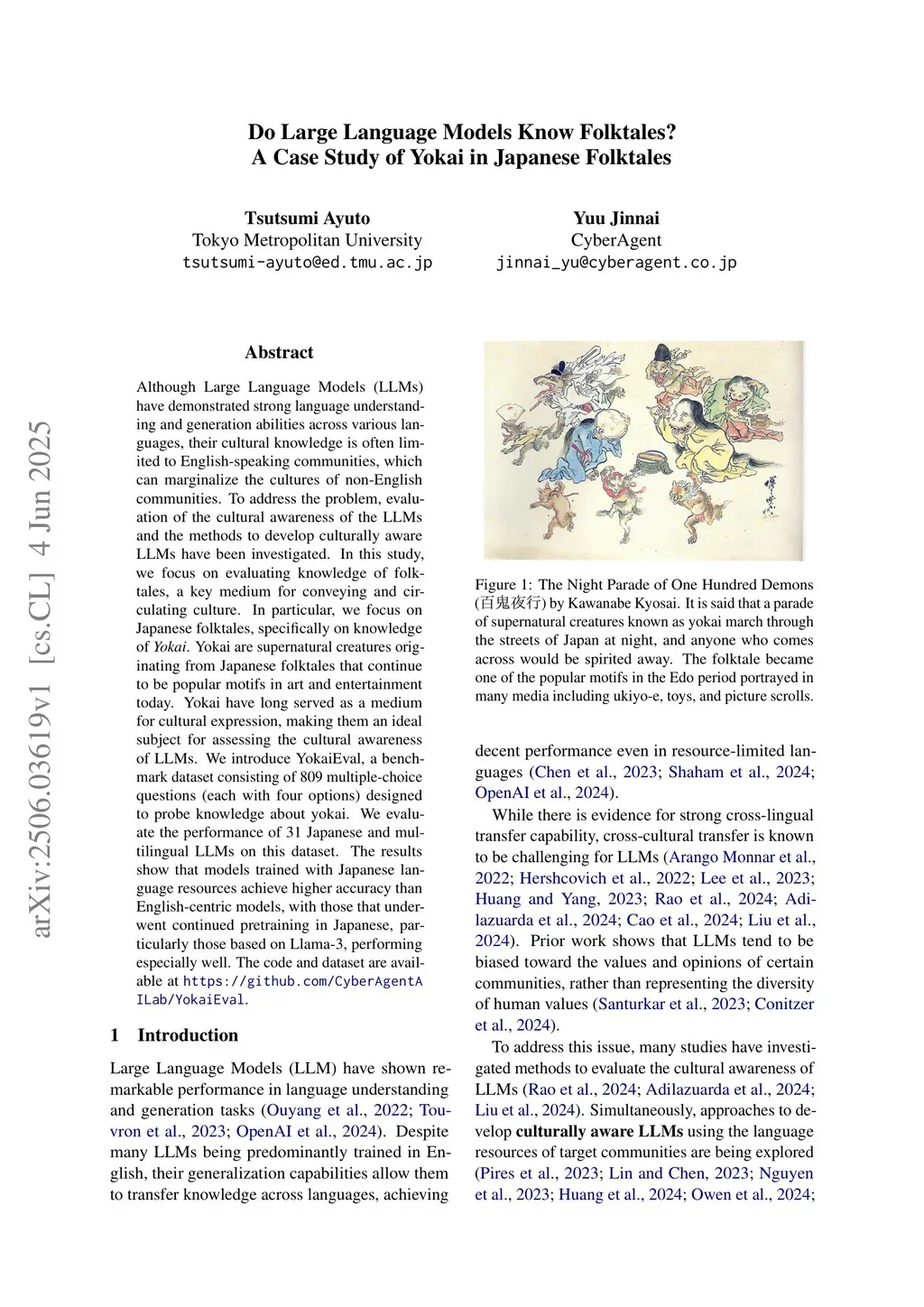 Do Large Language Models Know Folktales? A Case Study of Yokai in Japanese Folktales