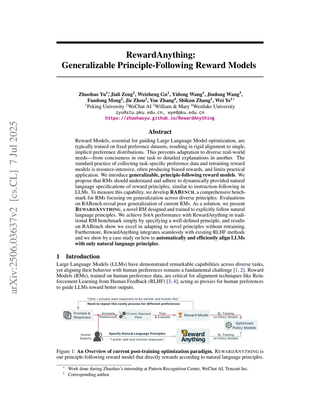 Reward Models, essential for guiding Large Language Model optimization, are typically trained on fixed preference datasets, resulting in rigid alignment to single, implicit preference distributions. This prevents adaptation to diverse real-world needs-from conciseness in one task to detailed explanations in another. The standard practice of collecting task-specific preference data and retraining reward models is resource-intensive, often producing biased rewards, and limits practical application. We introduce generalizable, principle-following reward models. We propose that RMs should understand and adhere to dynamically provided natural language specifications of reward principles, similar to instruction-following in LLMs. To measure this capability, we develop RABench, a comprehensive benchmark for RMs focusing on generalization across diverse principles. Evaluations on RABench reveal poor generalization of current RMs. As a solution, we present RewardAnything, a novel RM designed and trained to explicitly follow natural language principles. We achieve SotA performance with RewardAnything in traditional RM benchmark simply by specifying a well-defined principle, and results on RABench show we excel in adapting to novel principles without retraining. Furthermore, RewardAnything integrates seamlessly with existing RLHF methods and we show by a case study on how to automatically and efficiently align LLMs with only natural language principles.