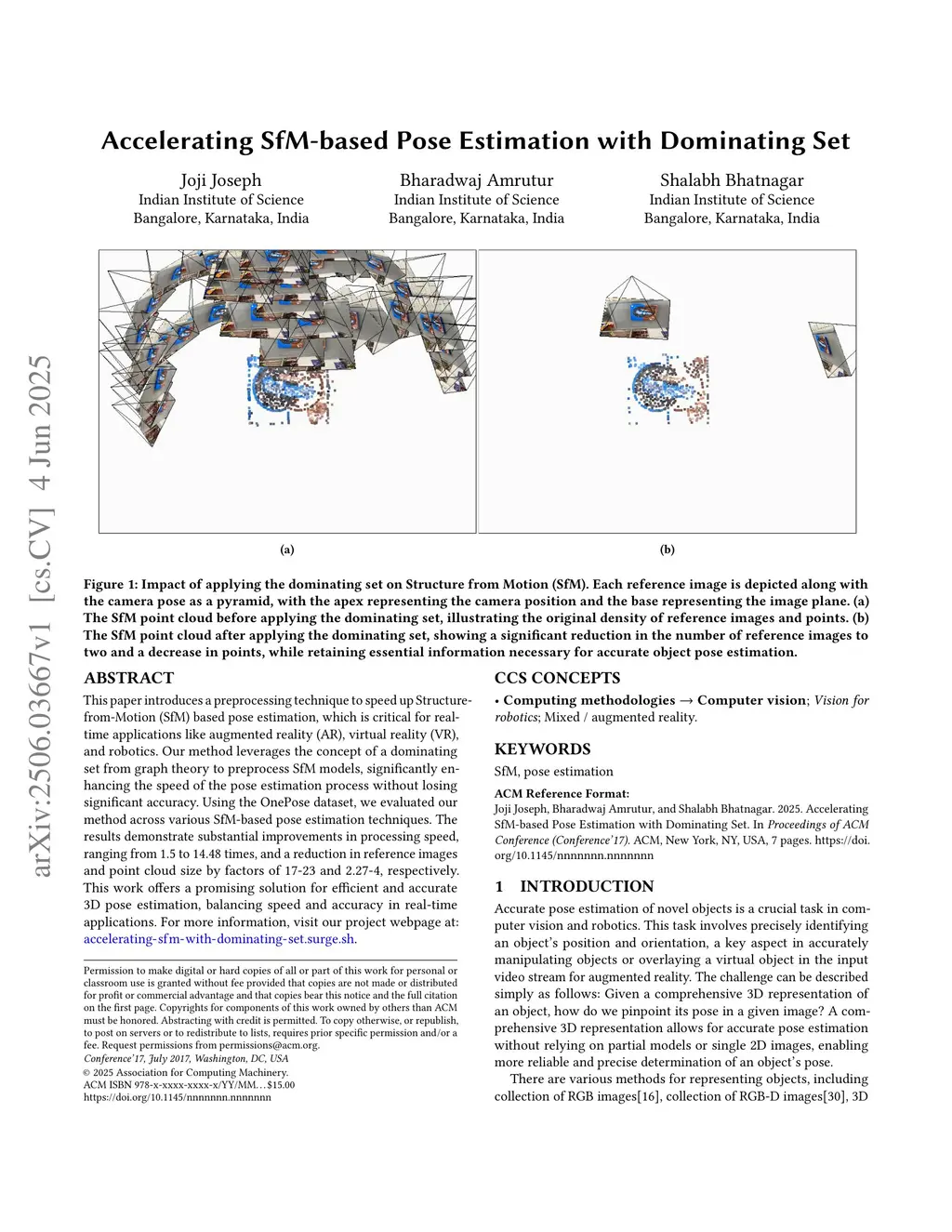 This paper introduces a preprocessing technique to speed up Structure-from-Motion (SfM) based pose estimation, which is critical for real-time applications like augmented reality (AR), virtual reality (VR), and robotics. Our method leverages the concept of a dominating set from graph theory to preprocess SfM models, significantly enhancing the speed of the pose estimation process without losing significant accuracy. Using the OnePose dataset, we evaluated our method across various SfM-based pose estimation techniques. The results demonstrate substantial improvements in processing speed, ranging from 1.5 to 14.48 times, and a reduction in reference images and point cloud size by factors of 17-23 and 2.27-4, respectively. This work offers a promising solution for efficient and accurate 3D pose estimation, balancing speed and accuracy in real-time applications.