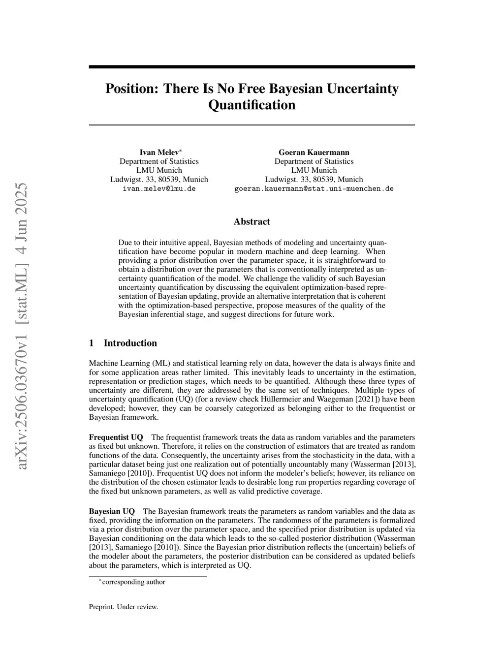 Due to their intuitive appeal, Bayesian methods of modeling and uncertainty quantification have become popular in modern machine and deep learning. When providing a prior distribution over the parameter space, it is straightforward to obtain a distribution over the parameters that is conventionally interpreted as uncertainty quantification of the model. We challenge the validity of such Bayesian uncertainty quantification by discussing the equivalent optimization-based representation of Bayesian updating, provide an alternative interpretation that is coherent with the optimization-based perspective, propose measures of the quality of the Bayesian inferential stage, and suggest directions for future work.