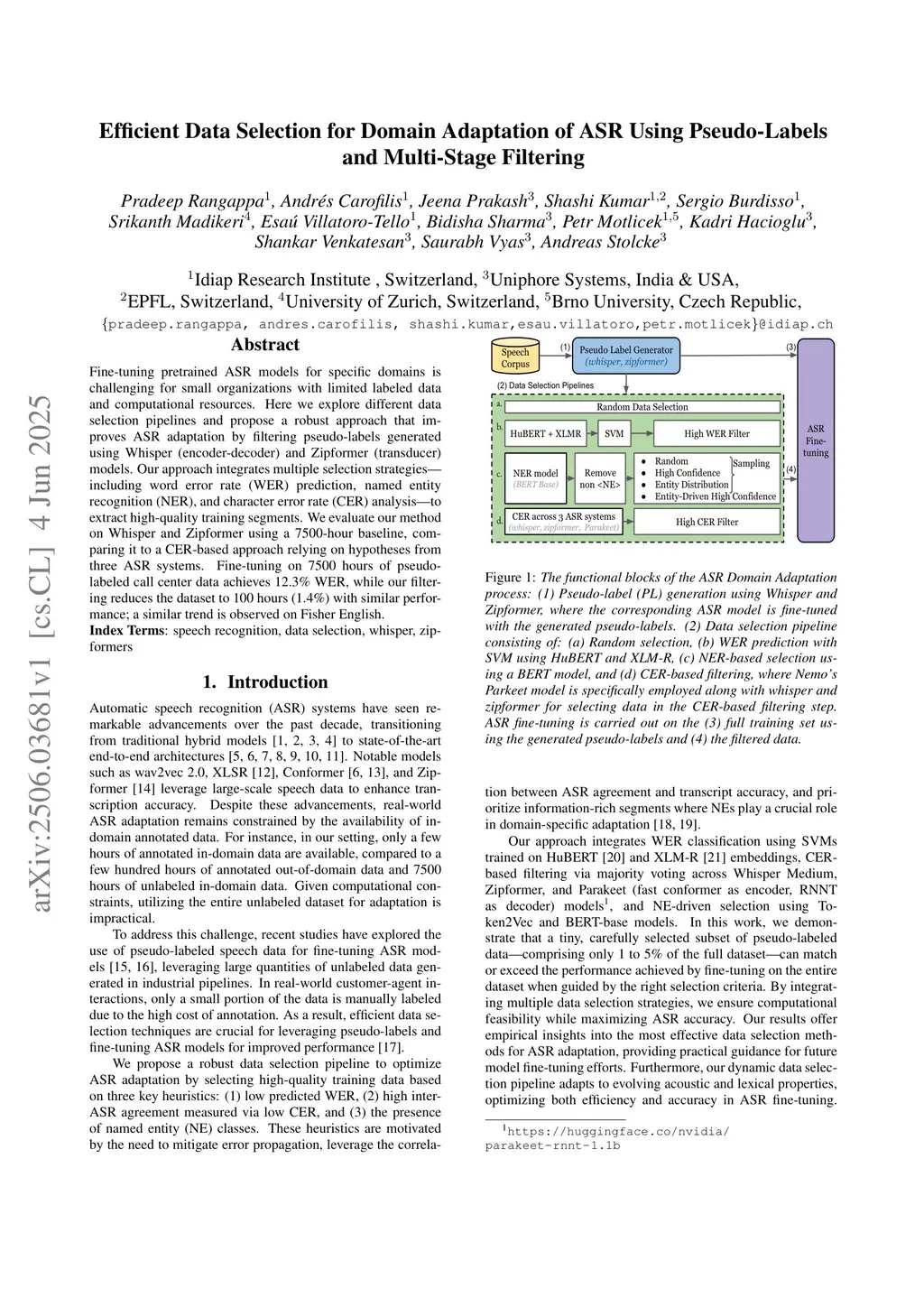Fine-tuning pretrained ASR models for specific domains is challenging for small organizations with limited labeled data and computational resources. Here, we explore different data selection pipelines and propose a robust approach that improves ASR adaptation by filtering pseudo-labels generated using Whisper (encoder-decoder) and Zipformer (transducer) models. Our approach integrates multiple selection strategies -- including word error rate (WER) prediction, named entity recognition (NER), and character error rate (CER) analysis -- to extract high-quality training segments. We evaluate our method on Whisper and Zipformer using a 7500-hour baseline, comparing it to a CER-based approach relying on hypotheses from three ASR systems. Fine-tuning on 7500 hours of pseudo-labeled call center data achieves 12.3% WER, while our filtering reduces the dataset to 100 hours (1.4%) with similar performance; a similar trend is observed on Fisher English.