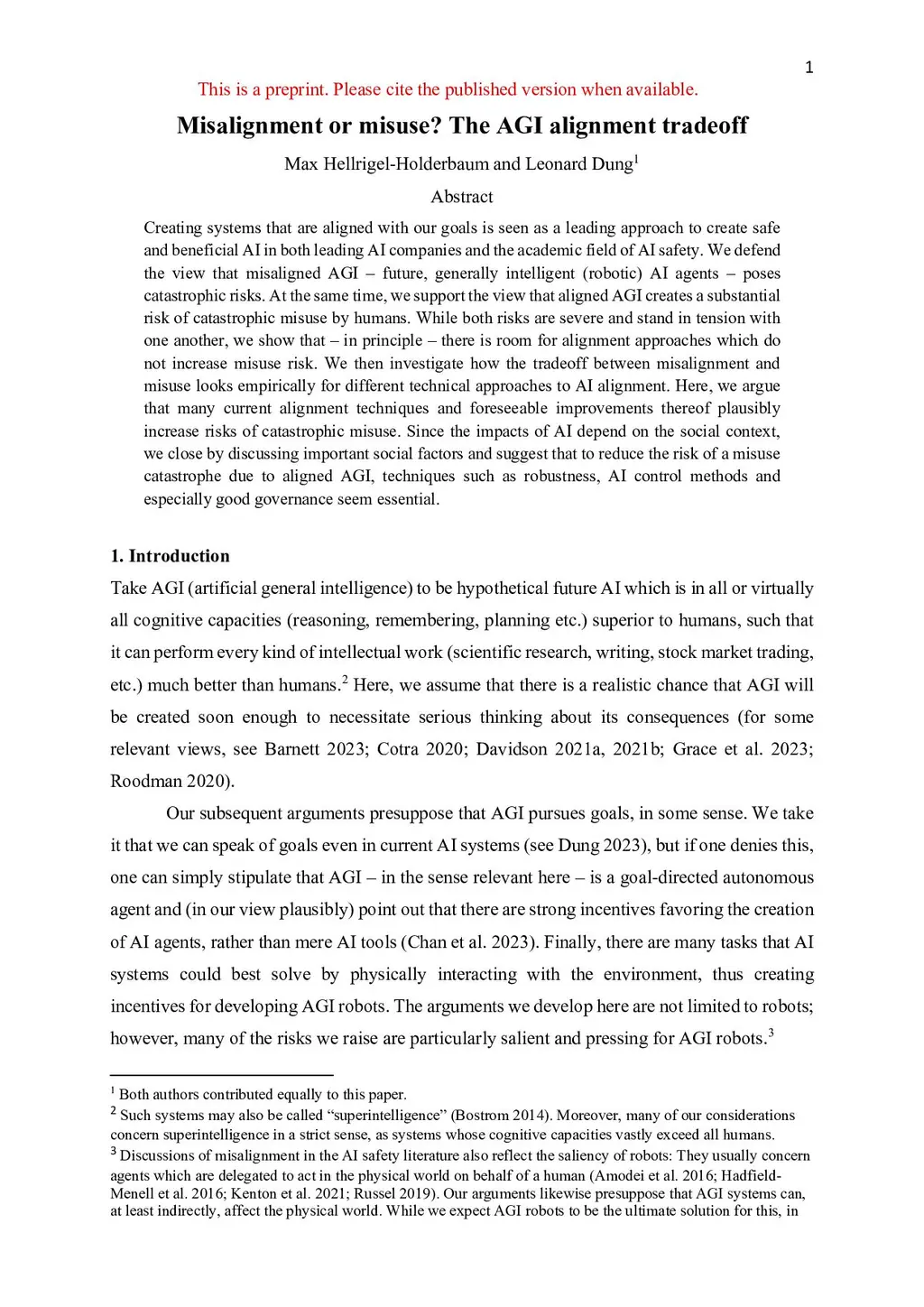 Creating systems that are aligned with our goals is seen as a leading approach to create safe and beneficial AI in both leading AI companies and the academic field of AI safety. We defend the view that misaligned AGI - future, generally intelligent (robotic) AI agents - poses catastrophic risks. At the same time, we support the view that aligned AGI creates a substantial risk of catastrophic misuse by humans. While both risks are severe and stand in tension with one another, we show that - in principle - there is room for alignment approaches which do not increase misuse risk. We then investigate how the tradeoff between misalignment and misuse looks empirically for different technical approaches to AI alignment. Here, we argue that many current alignment techniques and foreseeable improvements thereof plausibly increase risks of catastrophic misuse. Since the impacts of AI depend on the social context, we close by discussing important social factors and suggest that to reduce the risk of a misuse catastrophe due to aligned AGI, techniques such as robustness, AI control methods and especially good governance seem essential.