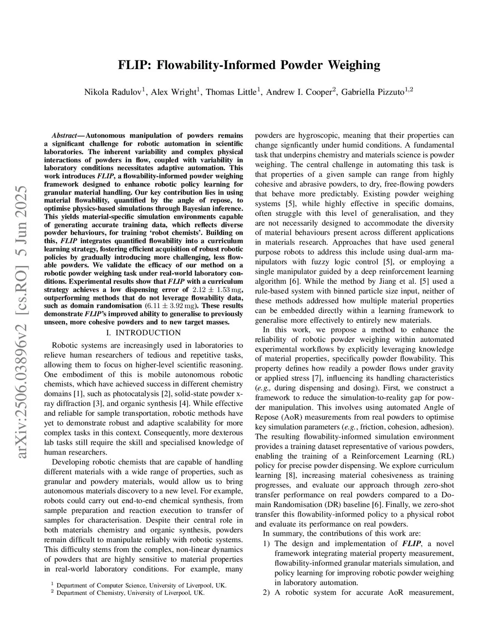 Autonomous manipulation of powders remains a significant challenge for robotic automation in scientific laboratories. The inherent variability and complex physical interactions of powders in flow, coupled with variability in laboratory conditions necessitates adaptive automation. This work introduces FLIP, a flowability-informed powder weighing framework designed to enhance robotic policy learning for granular material handling. Our key contribution lies in using material flowability, quantified by the angle of repose, to optimise physics-based simulations through Bayesian inference. This yields material-specific simulation environments capable of generating accurate training data, which reflects diverse powder behaviours, for training "robot chemists". Building on this, FLIP integrates quantified flowability into a curriculum learning strategy, fostering efficient acquisition of robust robotic policies by gradually introducing more challenging, less flowable powders. We validate the efficacy of our method on a robotic powder weighing task under real-world laboratory conditions. Experimental results show that FLIP with a curriculum strategy achieves a low dispensing error of 2.12 +/- 1.53 mg, outperforming methods that do not leverage flowability data, such as domain randomisation (6.11 +/- 3.92 mg). These results demonstrate FLIP's improved ability to generalise to previously unseen, more cohesive powders and to new target masses.